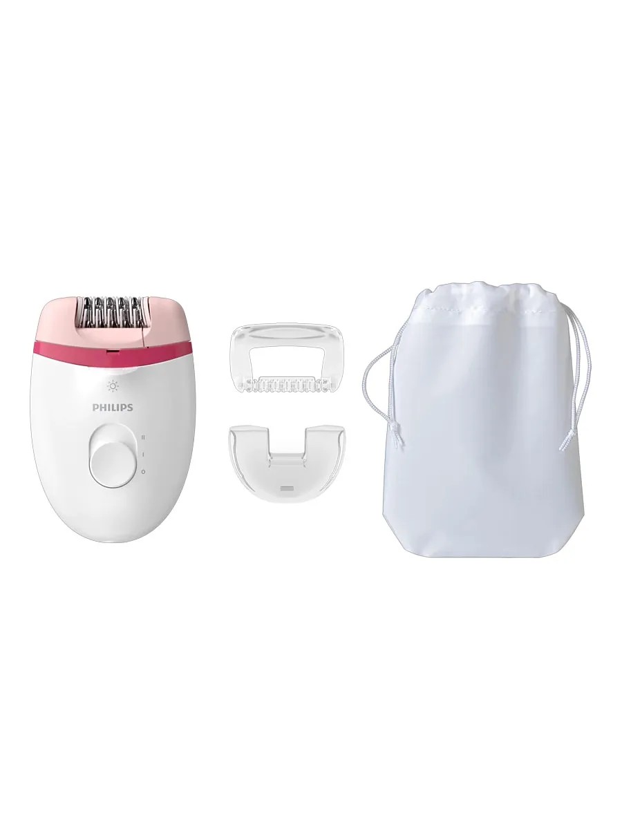 Philips Satinelle Essential BRE255/00 — women's epilator with Opti-light. Keyword searches: Philips BRE255/00, women's epilator, Satinelle Essential. 20 metal tweezers remove hairs as short as 0.5 mm, keeping skin smooth for up to four weeks. Two speed settings adjust to hair density, and a massage cap and a sensitive area attachment make the procedure comfortable. The ergonomic handle fits securely in the palm of your hand, and a built-in light illuminates the fine hair, eliminating missed areas. A removable, washable head simplifies hygiene, a long cable allows for unrestricted movement, and a travel case protects the device while traveling.