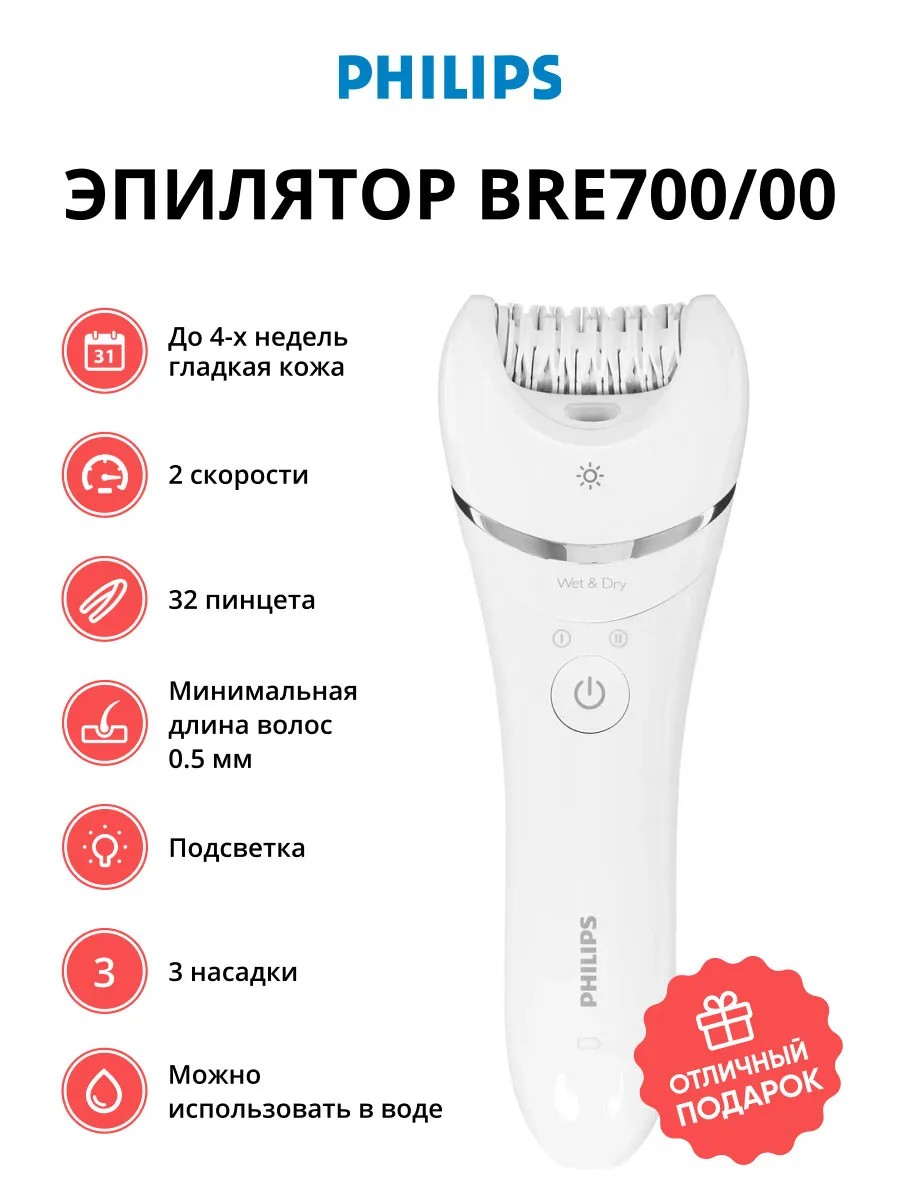 The Philips BRE700/00 epilator is designed with 32 tweezers that firmly grasp and remove hairs from the root. The handle features a button that allows you to select one of two head rotation speeds for maximum comfort. The device is equipped with a rechargeable battery with a capacity of up to 40 minutes of cordless operation. The kit includes additional attachments for skin smoothing and hair removal in delicate areas. The optimal head width allows you to treat a large area of ​​the body in one stroke. A built-in light provides the necessary visibility and increases the precision of epilation. Thanks to the waterproof design, the device head can be rinsed under running water. The kit includes a cleaning brush for the tweezers and a storage case for the Philips BRE700/00 epilator. The device has a wear-resistant plastic body. The ergonomic shape of the handle provides a comfortable grip.