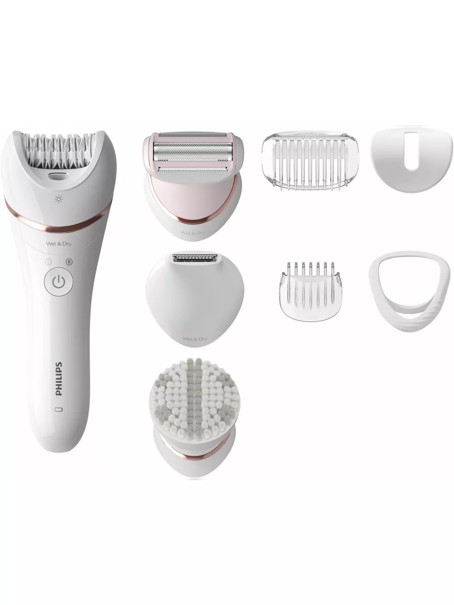 Philips BRE735/00 white epilator, 32 tweezers, 2 speed settings, 7 attachments included. Effective epilation that's gentle on your skin. Philips Series 8000 epilators offer effective yet gentle epilation. Enjoy smooth legs in just 10 minutes. Enjoy the epilator's advanced features with a full range of attachments. Included: shaver head, bikini trimmer attachment, bikini trimmer with comb, comb attachment, body exfoliation attachment, sensitive areas attachment, optimal contact attachment, case, and cleaning brush.