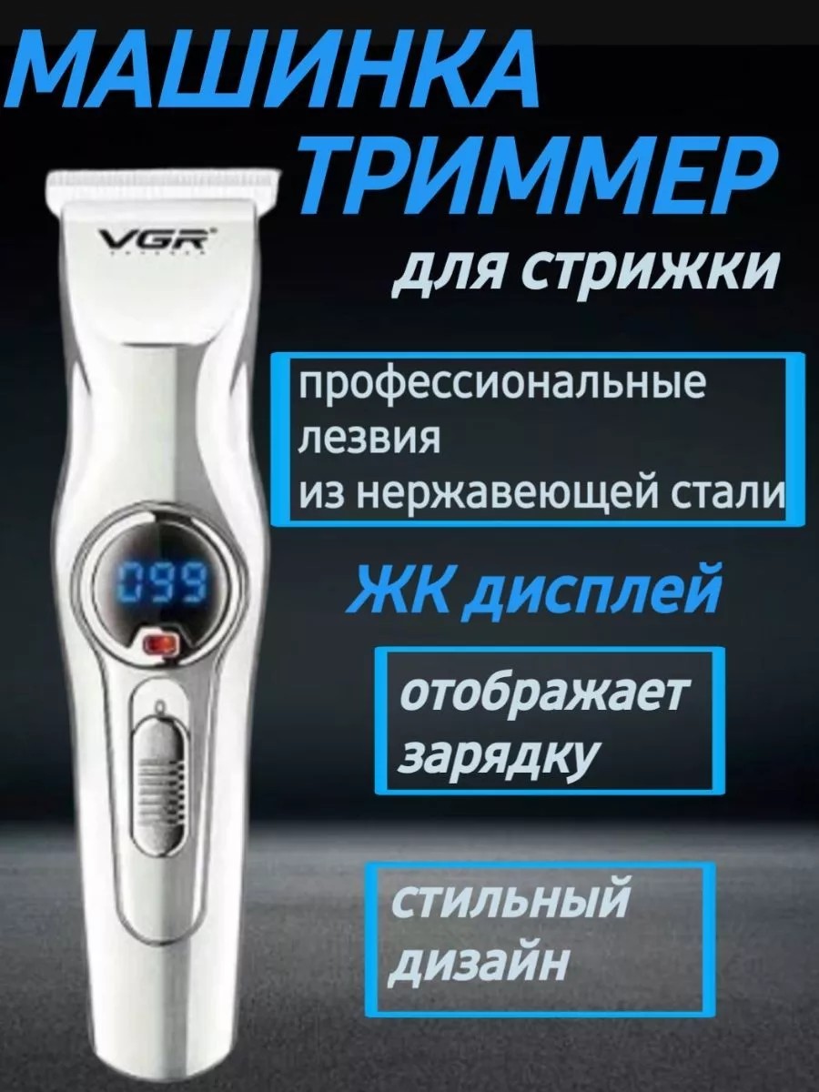Триммер для стрижки волос VGR Усовершенствованная режущая головка из титанового сплава имеет высокую механическую твердость и механическую прочность, тем самым значительно улучшая срок службы машинки для стрижки волос. Работает как с шнуром ,так и без . В комплекте 3 насадки 1мм, 3мм, 6мм, , и USB кабель. Бреет четко и чисто. Возможность регулировки ножей. Подойдёт для стрижки бороды ,окантовки ,шлифовки стрижки.литиевая батарея большой емкости 1500 мАч. Заряжается за 4 часа, время работы 180 минут. Инновационный двигатель, высокая мощность, быстрая резка волос, экономит много времени при стрижке .Машинка для стрижки волос с ЖК-дисплеем .Он отображает уровень заряда.Использование бренда исключительно для поиска!!!!
