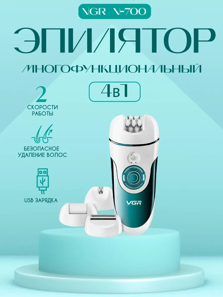 Эпилятор 4 в 1 модели V-700 от VGR создан для идеальной эпиляции, удаления волос и шелковистой, гладкой кожи. Эргономичный дизайн позволяет удобно держать депилятор женский электрический в руке. Бритвенный станок женский очень легок и прост в работе, что обеспечивает более легкие и точные движения - хороший выбор для удаления волос в труднодоступных зонах. Женский эпилятор работает от встроенного аккумулятора. Время работы при полном заряде - до 50 минут. Время зарядки аккумулятора - 8 часов. Особенностью данной модели является поддержка USB зарядки (USB-кабель входит в комплект). На передней части эпилятора расположен фонарик, что позволяет лучше видеть место удаления волос и использовать прибор в любое время суток. Эпилятором легко удалять волоски на лице и теле, подмышками, на ногах и в зоне бикини, делать интимный пилинг. Для депиляции бикини данная модель женской электробритвы отлично подходит. Триммер для бикини за счет дополнительной насадки также можно использовать как пемзу для ног. Электрическая бритва женская эпилятор VGR V-700. Его легко брать с собой в путешествие, отпуск и дачу. Он не займет много места. Отличный подарок для любимых! Машинка работает от встроенного аккумулятора. Время работы при полном заряде - до 50 минут. Время зарядки аккумулятора - 8 часов. Особенностью данной модели является поддержка USB зарядки (USB-кабель входит в комплект). На передней части эпилятора расположен фонарик, что позволяет лучше видеть место удаления волос и использовать прибор в любое время суток.