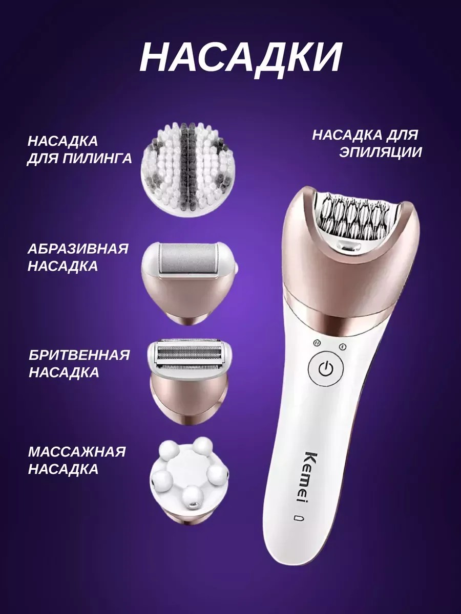 Особенности: - Это многофункциональный прибор с 1 эпиляционной головкой, 1 бритвенной головкой, 1 щеткой для чистки лица, 1 массажной головкой и 1 головкой для удаления мозолей