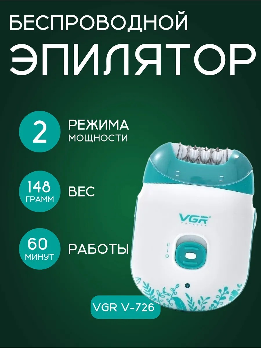 Эпилятор VGR V-726 сделает кожу ваших ног идеально гладкой надолго. Он бережно удаляет с корнем даже самые короткие волоски.Прибор оснащен эргономичной ручкой и головкой, которую можно промывать водой. Головка снимается с помощью нажатия двух боковых кнопок. И закрывается защитной крышечкой.Эпилятор работает от Lithium батареи 500 mAh и подзаряжается с помощью провода(есть в комплекте).Устройство работает в двух режимах, а система 18 пинцетов, сделает вашу кожу гладкой на несколько недель.Технические характеристики:· Система 18 пинцетов для быстрой и безопасной эпиляции;· 2 скоростных режима;· Время работы: 60 минут;· Время зарядки: 2 часа;· Lithium батарея, емкостью 500 mAh;· Мощность: 5 Вт;· Вес: 126 г.· Размеры: 100*70*30 ммКомплектация:1. Эпилятор.2. Кабель для зарядки.3. Щеточка.4. Защитная колпачок.5. Инструкция.6. Коробка