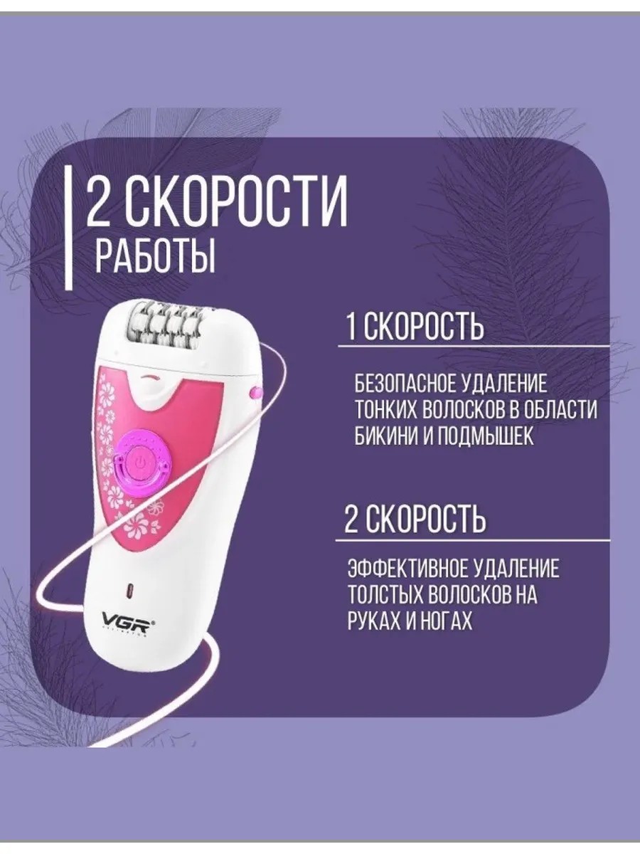 VGR V-722 - депилятор 2в1. Эпилятор удобно держится в руке и очень удобен в работе, обеспечивает более легкие и точные движения- идеальный выбор для удаления волос в труднодоступных зонах. Портативный прибор прост и удобен в эксплуатации, работает от встроенного аккумулятора. Отсутствие провода питания способствует комфорту и позволяет не привязываться к расположению розеток в помещении. Для подзарядки батареи в комплекте имеется сетевой адаптер. Предусмотрена и щеточка для очищения насадок. Эпилятор имеет два рабочих режима, благодаря чему можно регулировать скорость вращения головок, тем самым уменьшая болевые ощущения.Два режима работы: Скорость 1: для безопасного удаления более тонких волосков в чувствительных местах. Скорость 2: для особо эффективного удаления толстых волосков в таких областях как руки и ноги.