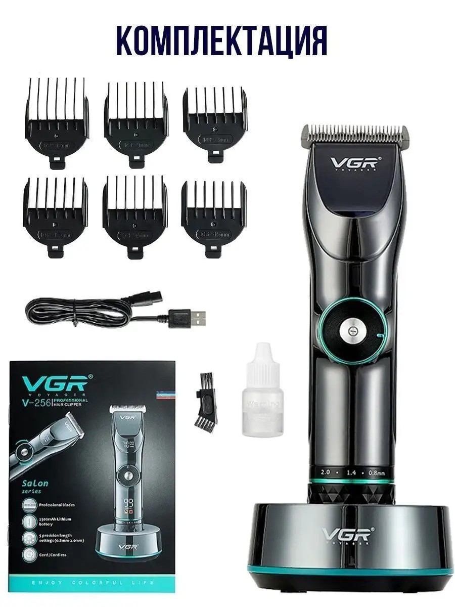 Машинка для стрижки волос VGR V-256 - профессиональная машинка, которая подходит и парикмахерам, и начинающим мастерам в домашних условиях. Данная машинка для стрижки волос беспроводная, надежная машинка с мощным аккумулятором на 2500mA. Время работы от аккумулятора - до 400 минут. Время зарядки около 4 часов. В нижней части корпуса данной модели расположен удобный кольцевой переключатель для выбора длины стрижки от 0,8 мм до 2 мм, что дает возможность установить нужную длину среза волос. Также увеличить длину среза волос можно при помощи входящих в комплект 6 дополнительных сменных насадок. На передней части корпуса расположены ДВА LCD-дисплея: первый показывает уровень заряда аккумулятора в процентах, а второй - скорость работы в оборотах в минуту (от 5500 до 7000!). Скорость работы (количество оборотов) можно регулировать с помощью кольцевого селектора, расположенного на передней части машинки. ТИП: Машинка для стрижки волос / Триммер для стрижки волос / VGR V-256 / Машинка для стрижки волос с аккумулятором / Машинка для стрижки с насадками / Машинка для стрижки волос и бороды / Машинка для стрижки волос беспроводная / Беспроводная машинка для стрижки волос / Машинка для стрижки волос профессиональная / Машинка для стрижки волос с дисплеем / Триммер для бороды и усов
