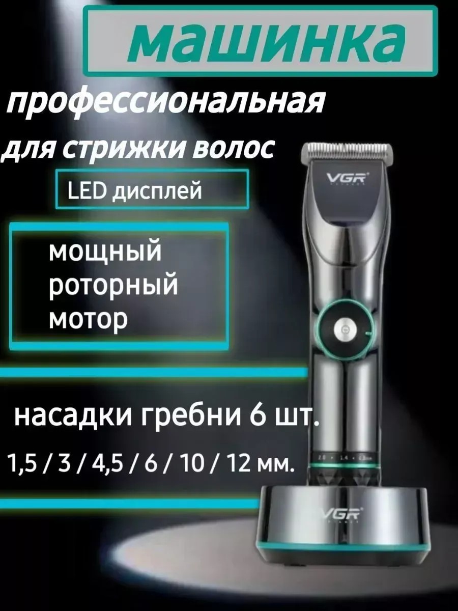 Машинка для стрижки волос VGR256 - профессиональная машинка, которая подходит и парикмахерам, и является помощником в уходе за волосами в домашних условиях.V-256 - беспроводная, надежная машинка с мощным аккумулятором на 2500mA. Время работы от аккумулятора - до 400 минут. Время зарядки до 4 часов.На передней части корпуса данной модели расположен удобный переключатель для выбора длины стрижки от 0,8 мм до 2 мм, что дает возможность сделать желаемую прическу. Также смоделировать прическу можно при помощи входящих в комплект 6 дополнительных сменных насадок для определения длины стрижки - 1.5 мм, 3 мм, 4.5 мм, 6 мм, 9 мм, 12 мм.На передней части корпуса расположен LCD-дисплей, который показывает уровень заряда аккумулятора в процентах и уровень скорости работы. Скорость работы (количество оборотов) можно регулировать с помощью бегунка расположенного на передней части машинки от 55 до 70 оборотов. Использование бренда исключительно для поиска!!!