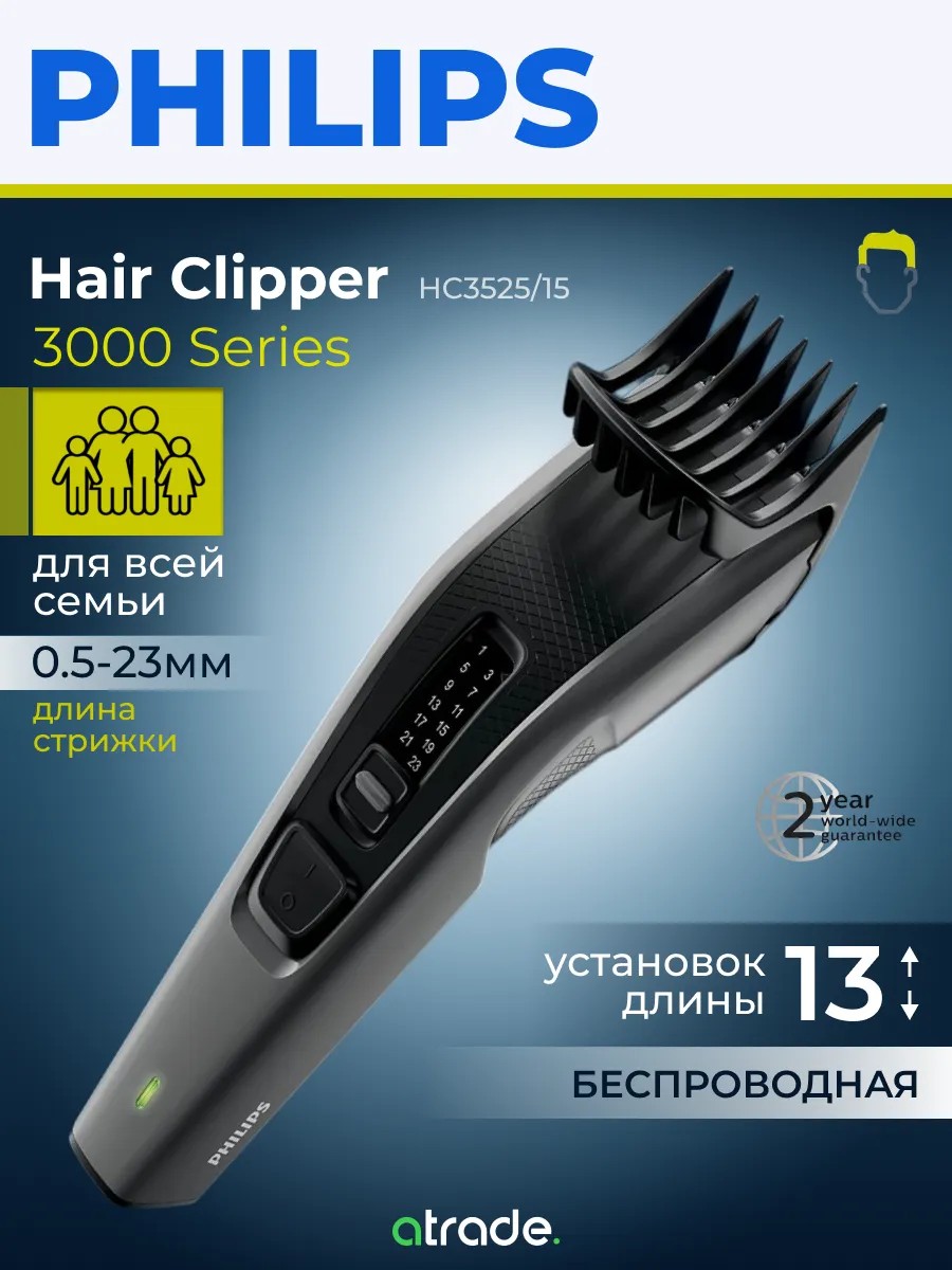 The Philips HC3525/15 electric hair clipper is a great hair care assistant. This versatile tool is suitable for men and women who prefer short haircuts. It will provide high-quality hair styling at home. The device operates on both mains power and a built-in battery. The kit includes a power adapter with a 1.8-meter cord and a European plug, as well as two attachment combs that adjust the length from 0.5 to 23 mm. The battery with DuraPower technology provides up to 45 minutes of cordless runtime. 13 length settings allow you to accurately trim your hair and groom your beard and moustache. The compact size of the corded device makes it easy to store. You can take it on the go or use it at home. All accessories are packed in a box. The model's silent motor ensures comfortable operation, while the durable plastic body and handle provide a comfortable grip. This razor with self-sharpening stainless steel blades guarantees precision cutting and long-lasting use. Regular cleaning prolongs its lifespan for years to come. The rounded edges of the attachments protect against injury and hair pulling, making it suitable for cutting newborns and family use. The children's hair clipper is activated by a push-button switch. Today's trends demand a professional approach to hair styling not only in salons but also at home. The blades of this men's trimmer are ideal for removing split ends, creating a beautiful barbershop-style. This gift is appropriate for Valentine's Day for a godfather, father, son-in-law, grandfather, brother, or for a loved one's birthday. This edging trimmer will delight men of any age. Maintain a stylish look with the HC3525/15! Maintenance is easy thanks to the brush and washable blades. Manufacturer: PHILIPS CONSUMER LIFESTYLE BV, The Netherlands, Tussendiepen 4, 9206 AD Drachten