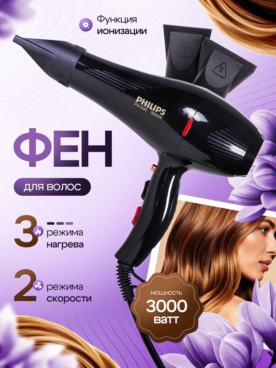 Фен Philips - достаточно тихий. Имеет две кнопки настройки. Фен для волос с насадками предназначен для домашнего использования. Прибор оснащен системой ионизации, которая придает гладкость структуре ваших волос. Мощность составляет 3000 Вт это обеспечит максимально быструю сушку волос. Он оснащен опцией подачи холодного воздуха для закрепления укладки. Также присутствует независимая регулировка воздушного потока и индикация включения. Максимальное удобство в использовании достигнуто благодаря длинному сетевому шнуру 1,8 м, а также его вращению вокруг своей оси. Специальная петелька для подвешивания обеспечивает хранение в ванной или у зеркала на крючке. Модель выпускается в черном цвете. Вес прибора составляет 540 грамм, что позволяет его использовать не только в домашних условиях, но и в поездке. Прибор имеет 6 комбинаций режимов работы: 3 режима нагрева и 2 скорости воздушного потока.