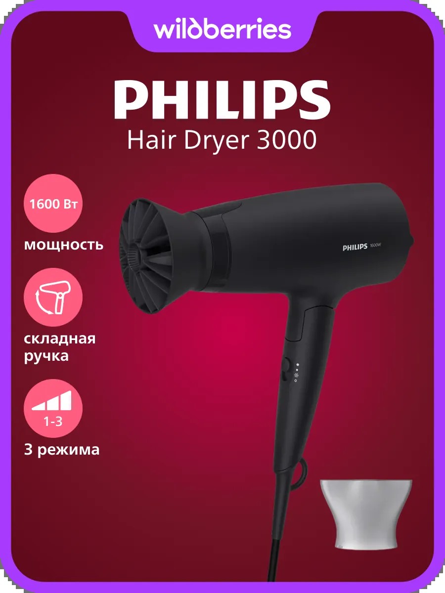 Фен для волос Philips Series 3000 BHD308/10 выполнен в черном корпусе и имеет складную конструкцию, поэтому является идеальным дорожным вариантом. Обладая мощностью 1600 Вт, прибор создает довольно мощный поток воздуха, чтобы быстро высушить волосы.