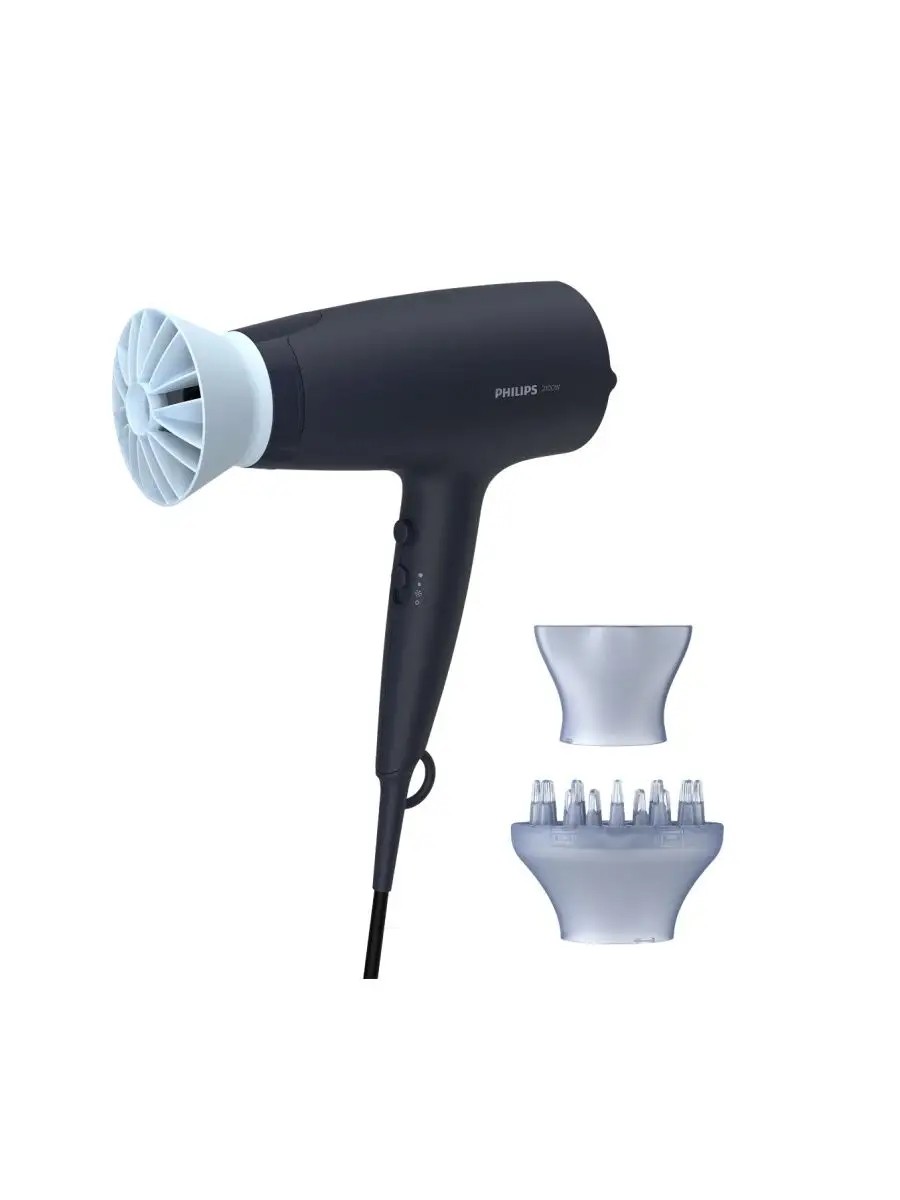 The Philips BHD360/20 hair dryer is a powerful, multifunctional device for gentle hair care. It boasts quiet operation thanks to an innovative air intake design. The air intake grille maximizes airflow, while the ergonomic design improves airflow within the device. The result is excellent speed and high efficiency. According to testing, this hair dryer is 35% quieter than similar models. It allows for the most efficient and effective drying and styling. The Philips BHD360/20 hair dryer is easy to use thanks to its special design and ergonomic handle. Its lightweight design also adds to its comfort. Several additional attachments are included: a concentrator for targeted airflow and a diffuser for root volume. Even a novice hairdresser can quickly create neat and stylish hairstyles for a perfect look. The Philips BHD360/20 features a convenient storage loop. The manufacturer utilizes innovative technology for particularly gentle hair drying. It uses an optimally blended cold and hot airflow, ensuring fast drying at a temperature 15°C lower than standard. The model features six settings that can be adjusted to suit your hair structure, type, and condition. A cool shot mode ensures a secure hold. A built-in ionization system further enhances hair's smooth, healthy appearance.