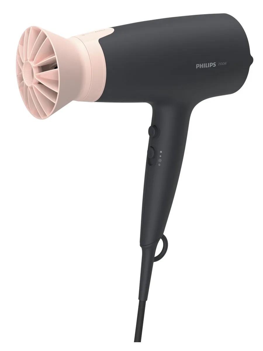 The Philips BHD350/10 hair dryer is a powerful and reliable tool for quick and gentle hair styling, combining advanced technology with ease of use. With 2100W of power and a DC motor, the device delivers an intense airflow, allowing you to dry hair quickly without overheating. ThermoProtect technology distributes heat evenly, preventing overheating and maintaining healthy hair, while the ionization function eliminates static electricity, leaving hair smooth and shiny. The kit includes two attachments: a 14mm concentrator for precise styling and a special ThermoProtect nozzle for additional protection. The device features six temperature and speed settings, including a cool shot, allowing you to adapt the drying experience to any hair type and finish your style with a finishing touch. A convenient hanging loop and a 1.8-meter cord ensure comfortable use. The hair dryer operates on standard 220–240 V, making it ideal for home use. The Philips BHD350/10 combines professional quality, hair care, and ergonomic design to satisfy even the most demanding users.