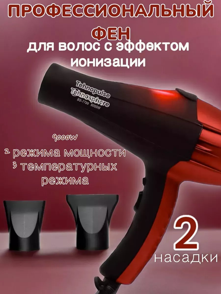 Фен мощностью 9000 Вт имеет в комплектации 2 насадки, которые направляют воздух на определенные участки волос для более быстрой сушки и придания определённой формы каждому локону.