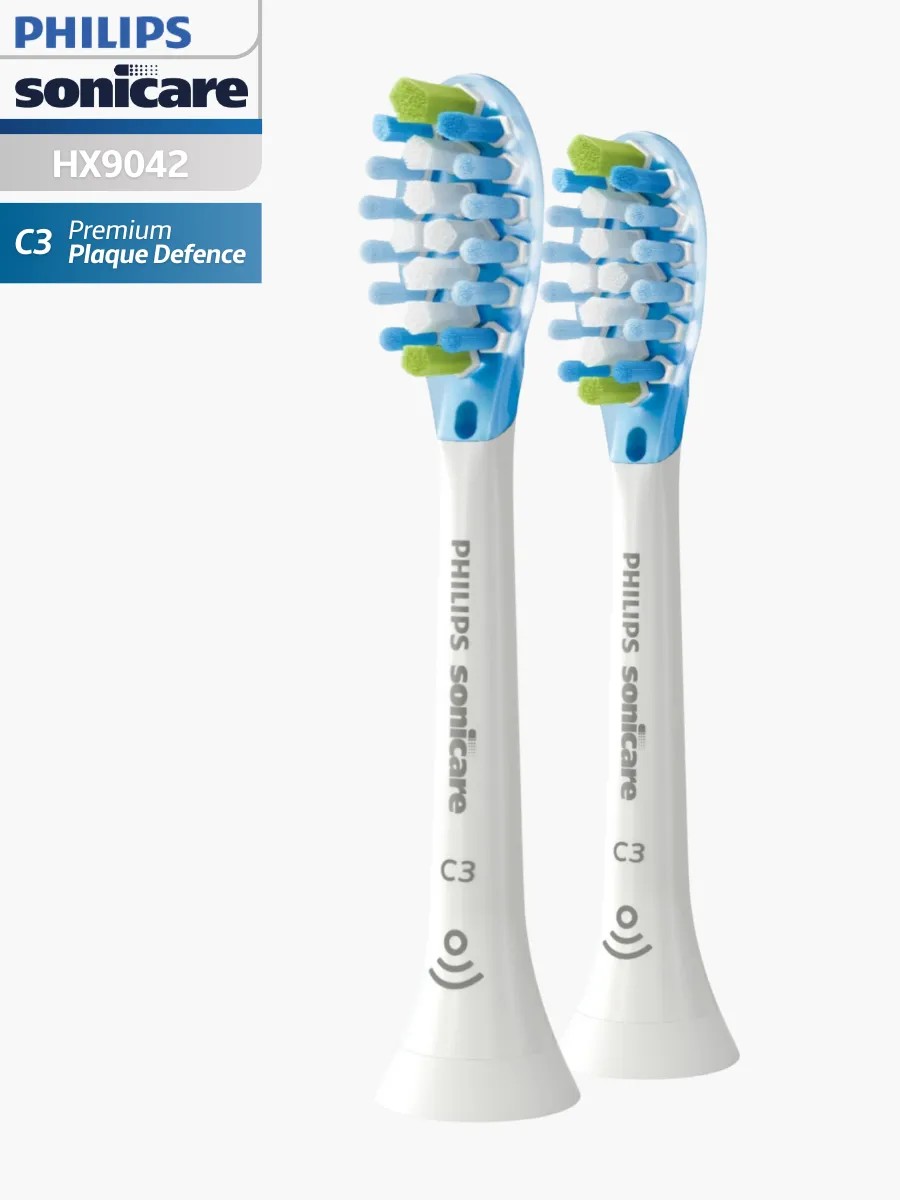 Компания Philips выпустила насадки HX9042 C3 Premium Plaque Defence, которые специально предназначены для тщательного очищения налета из труднодоступных мест полости рта. Основание насадки имеет уникальную структуру. Благодаря гибкими ребрами, выполненными из резины, щетинки насадки могут подстраиваться под форму каждого зуба. Основание насадки легко поглощает избыточное давление во время чистки, что позволяет тщательно очищать налет, не повреждая эмаль и не травмируя десна. Чистящие насадки станут менее эффективными через 3 месяца использования, но с BrushSync вы получите напоминание еще до окончания этого срока. Интеллектуальная зубная щетка отслеживает частоту и интенсивность использования, поэтому вы получите уведомление, когда придет время замены. У вас нет интеллектуальной щетки Philips Sonicare? Просто следите за синими индикаторными щетинками и замените насадку, когда они станут белыми. Комплект включает в себя 2 одинаковые насадки. Стоматологи рекомендуют менять насадки данного типа не реже, чем раз в 3 месяца.