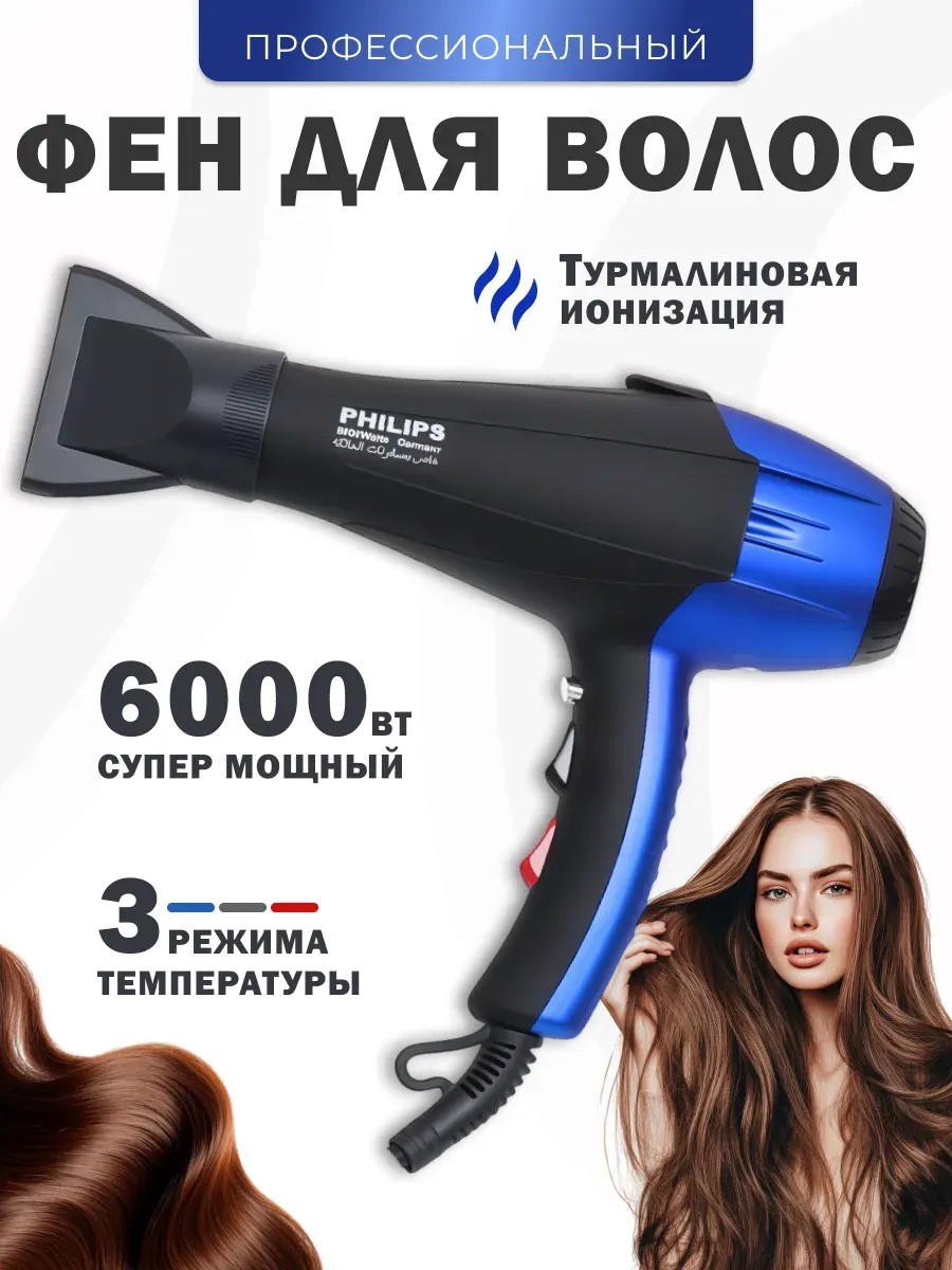 Фен с высокой мощностью 6000 Вт позволяет быстро высушить даже самые густые и длинные волосы. Три режима нагрева (холодный, теплый, горячий) и две скорости воздушного потока обеспечивают индивидуальный подход к разным типам волос. В комплекте идут насадки для фена: концентраторы для точной укладки. Благодаря длинному шнуру 2,7 м и эргономичной ручке, фен для сушки волос удобен в использовании и не сковывает движения.