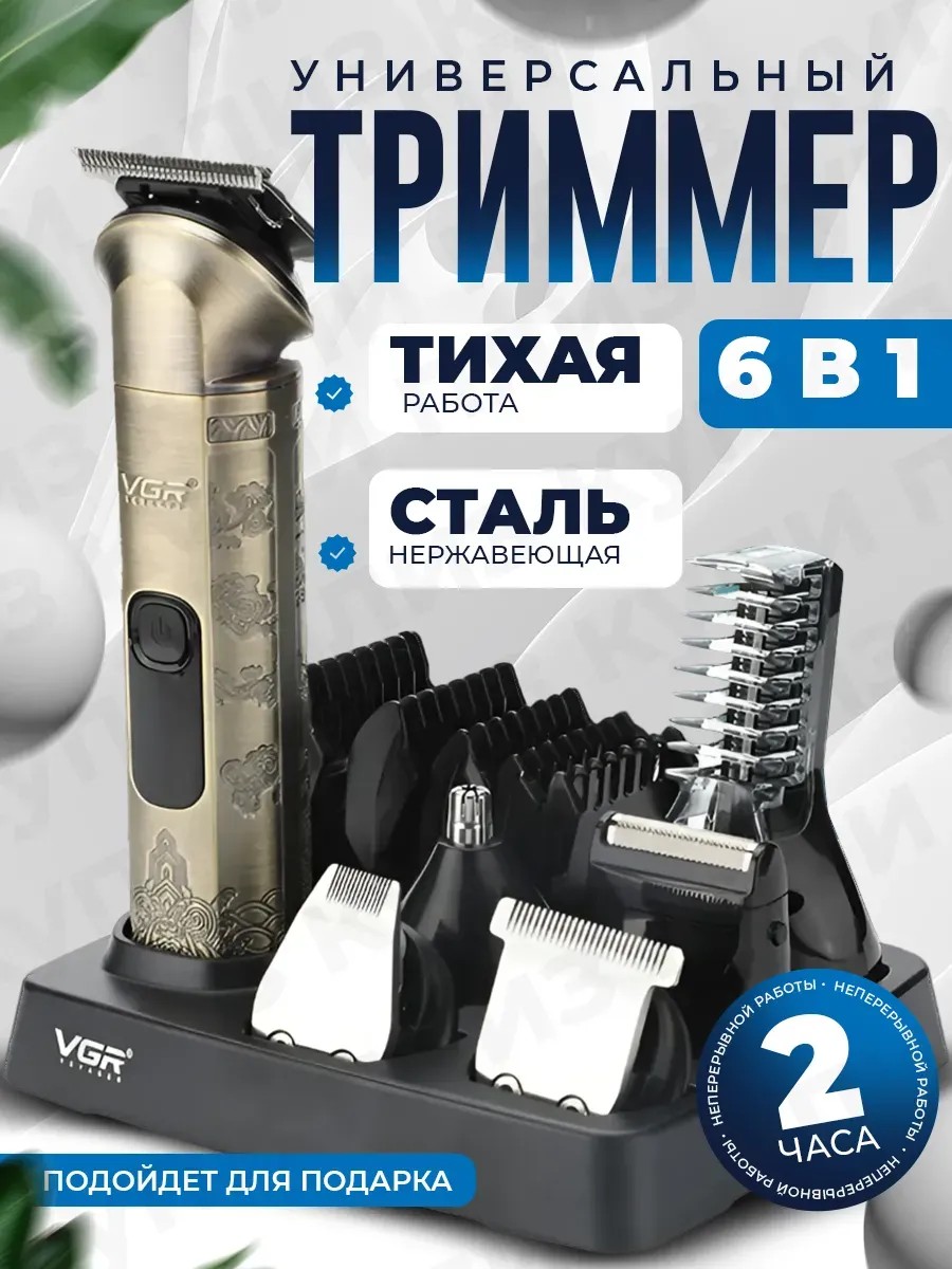 Набор для стрижки VGR V-109 — это многофункциональный триммер, который с легкостью заменит вам несколько устройств. Комплект из шести сменных лезвий решает множество различных задач. Материал лезвия из нержавеющей стали специально разработан для бережного обращения с вашей кожей, обеспечивая эффективное и гладкое бритье и стильный вид. Триммер является электрическим, беспроводным и профессиональным, обладает ЖК-цифровым дисплеем и различными насадками, обеспечивает низкий уровень шума. Он идеально подходит как машинка для стрижки волос, предлагая беспроводной набор. Основное лезвие триммера имеет прецизионную (высокоточную) заточку и комплектуется 4 сменными насадками. Лезвие для стрижки головы превращает устройство в полноценную машинку для стрижки волос. Так же имеет 5 сменных насадок (3/6/9/12/15мм). Лезвие для окантовки внесет последние штрихи в стрижку и оставит за собой ровные линии или узоры. Лезвие для волос в носу и ушах избавит вас от рутины удаления нежелательных волосков. В основном предназначено для удаления волос с рук и ног. Насадка-бритва окончательно разберется с растительностью на лице и не оставит и намека на щетину. Корпус триммера выполнен из металла золотого цвета, гравированного в морском стиле. Данный комплект надежен и прочен, изготовлен из высококачественных материалов, которые обеспечивают долговечность использования. В основании располагается светодиодный дисплей, отражающий остаточное время заряда в процентах.Работа триммера возможна как от сети, так и автономного аккумулятора. Литиевая батарея ёмкостью 1200 мАч гарантирует непрерывную работу в течении 180 минут, а благодаря разъему Type-С время полного заряда составляет 1.5 часа.