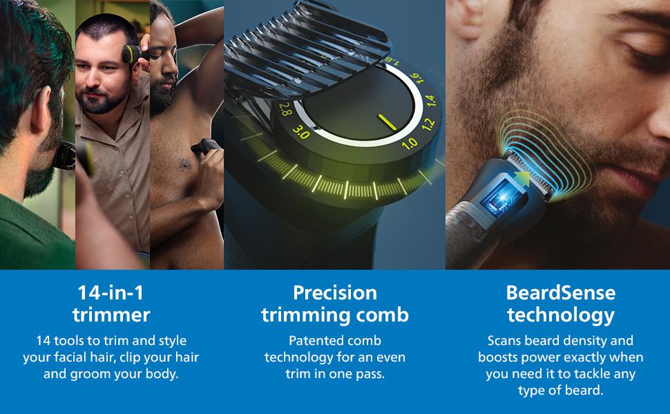 Powerful lithium-ion battery: 120 minutes runtime, 5 minute quick charge option. USB-A charging (power adapter not included). BeardSense technology: scans beard density 125 x per second and boosts power exactly when you need it to tackle any type of beard. Self-sharpening stainless steel blades: remain as sharp as day one for long-lasting performance. No oil required. Precision trimming comb: offers 11 length settings between 1-3 mm in 0.2 mm precision steps for an even trim at the exact length you want. 14 tools for all of your grooming needs: beard trimming, body grooming, hair clipping, nose ear eyebrow trimming. 21 length settings (0.5-16 mm) for any beard style.