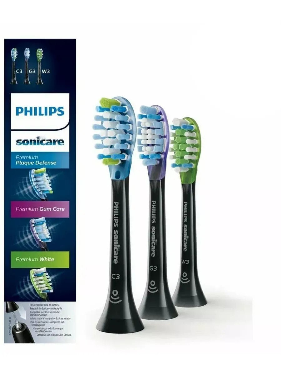 The set includes three brush heads: C3 Premium Plaque Defense, W3 Premium White, and G3 Premium Gum Care.