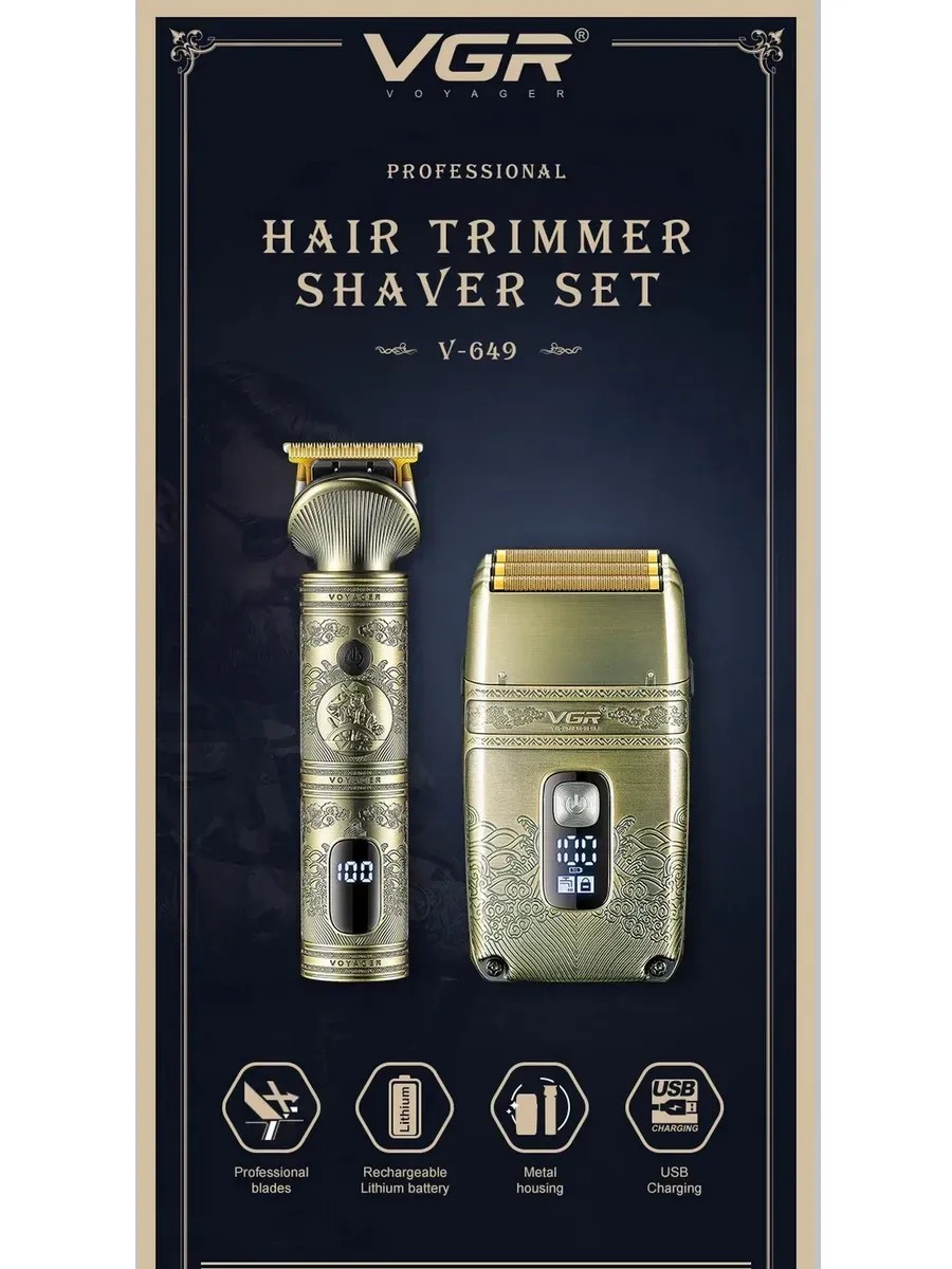 VGR V-649 Professional Hair Cutting Shaving Set. Superior Quality: The trimmer and shaving set are made with a durable metal body and precision blades, delivering excellent performance. Stainless Steel Blades: High-quality stainless steel blades ensure precise and long-lasting haircuts. LED Display: A user-friendly digital screen with easy-to-read battery indicators allows you to monitor your usage. Powerful Motor: The trimmer and shaver are equipped with a powerful rotary motor for precise hair cutting and shaving. Waterproof: The shaver has an IPX6 protection rating, making it completely waterproof, allowing you to shave in any conditions without the risk of damage or corrosion. Package Includes: 1 * Shaver and Trimmer Set 4 * Cutting Combs (1-3-5-7mm) 1 * USB Charging Cable 1 * Cleaning Brush 1 * Protective Cap 1 * Carrying Bag storage