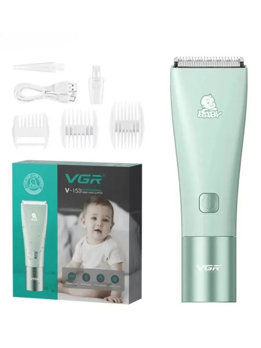 Аккумуляторная детская машинка для стрижки волос V-153 с пониженным уровнем шума и насадками для аккуратной и бережной стрижки детей с самых малых лет. Кроме самой машинки в комплект входит: