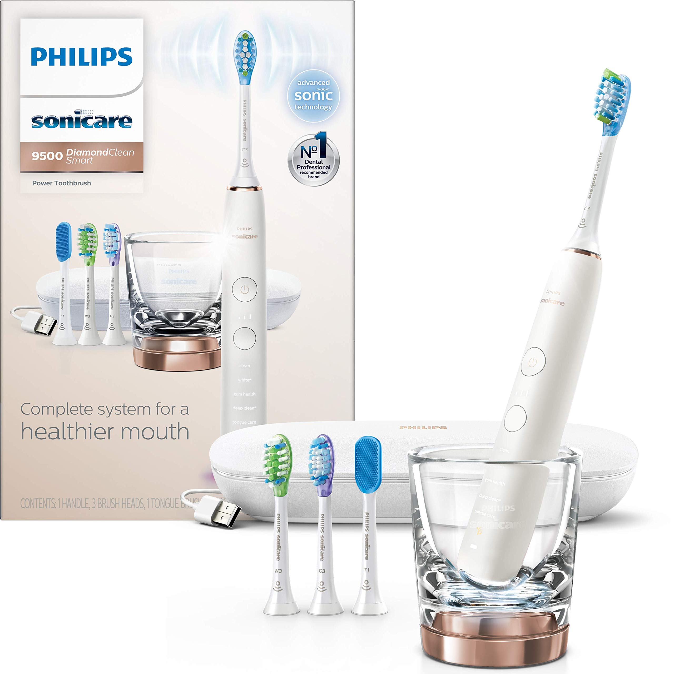 Get the ultimate and most complete care with DiamondClean Smart. Eliminate guesswork with real time feedback and personalized coaching so you can improve your technique and achieve 100% confidence in your oral care. It's more than just a toothbrush - it's a complete oral care solution. Featuring Sonic technology, 5 brushing modes and smart brush head mode pairing technology, the Philips Sonicare DiamondClean Smart Rechargeable toothbrush delivers superior plaque removal, gum health and whitening performance. Philips Sonicare DiamondClean Smart goes beyond traditional cleaning to deliver up to 10x more plaque removal*, removes 100% more stains in just 3 days** and improve Gum Health up to 7x in just 2 weeks*** . It also features a visual pressure sensor to alert you when you are brushing too hard. Customize your brushing experience using the 5 different modes and 3 intensity settings and know when to replace your brush head via a customized reminder. Its charging glass that can be used for charging or to rinse your mouth after brushing. A USB charging travel is also included to allow you to charge your toothbrush on the go *vs. a manual toothbrush ** vs. a manual toothbrush in white+ mode *** vs. a manual toothbrush in Gum Health mode. Subscribe & Save on genuine Philips Sonicare brush head replacements and save up to 15%./br/brSubscribe & Save on genuine Philips Sonicare brush head replacements and save up to 15%. Includes: 1 Connected Sonicare toothbrush handle with 5 modes 1 Premium Plaque Control brush head 1 Premium White brush head 1 Premium Gum Health brush head 1 TongueCare+ brush head 1 charging glass 1 charging travel case 1 wall plug. 5 modes: Clean, White+, Deep Clean+, Gum Health, TongueCare & 3 intensity levels. 4 different smart brush head types automatically pair with the appropriate brushing mode and smart sensors provide real time feedback. Removes up to 100% more stains in just 3 days (in white+ mode vs. a manual toothbrush). Removes up to 10x more plaque and improves gum health up to 7x in just 2 weeks (in gum health mode vs. a manual toothbrush). Complete oral care with smart sensor technology for an exceptional clean./br/brGTIN: 075020079404. Best Sellers Rank: See Top 100 in Health & Household. Handle Material: Plastic. Model Name: DiamondClean Smart 9500. Included Components: Handle-1 DiamondClean Smart Brush heads-1 C3 Premium Plaque Control, 1 G3 Premium Gum Care, 1 W3 Premium White, 1 TongueCare+ tongue brush: Glass charger-1Travel case:USB charging, travel case See more. Unit Count: 4 Count. Number of Items: 1. Color: Rose Gold. Power Source: Corded Electric. Special Feature: Customizable, Brushing Timer, Pressure Sensor. Age Range (Description): Adult. Brand: Philips Sonicare. International Shipping: This item can be shipped to select countries outside of the U.S. Domestic Shipping: Currently, item can be shipped only within the U.S. and to APO/FPO addresses. For APO/FPO shipments, please check with the manufacturer regarding warranty and support issues. Country of Origin: Indonesia. : B07CC2K76R. Manufacturer: Philips Oral Healthcare. UPC: 075020079404. Batteries: 1 AAA batteries required. (included). Item model number: HX9924/61. Product Dimensions: 4.37 x 6.85 x 9.92 inches 2.31 Pounds.