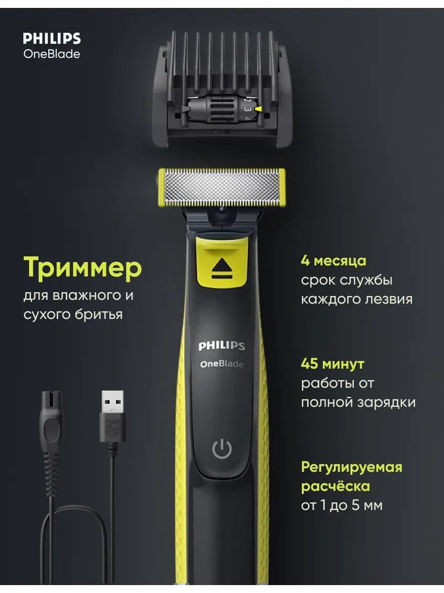 **Philips OneBlade QP2724/20 — универсальный триммер и бритва для лица и тела**