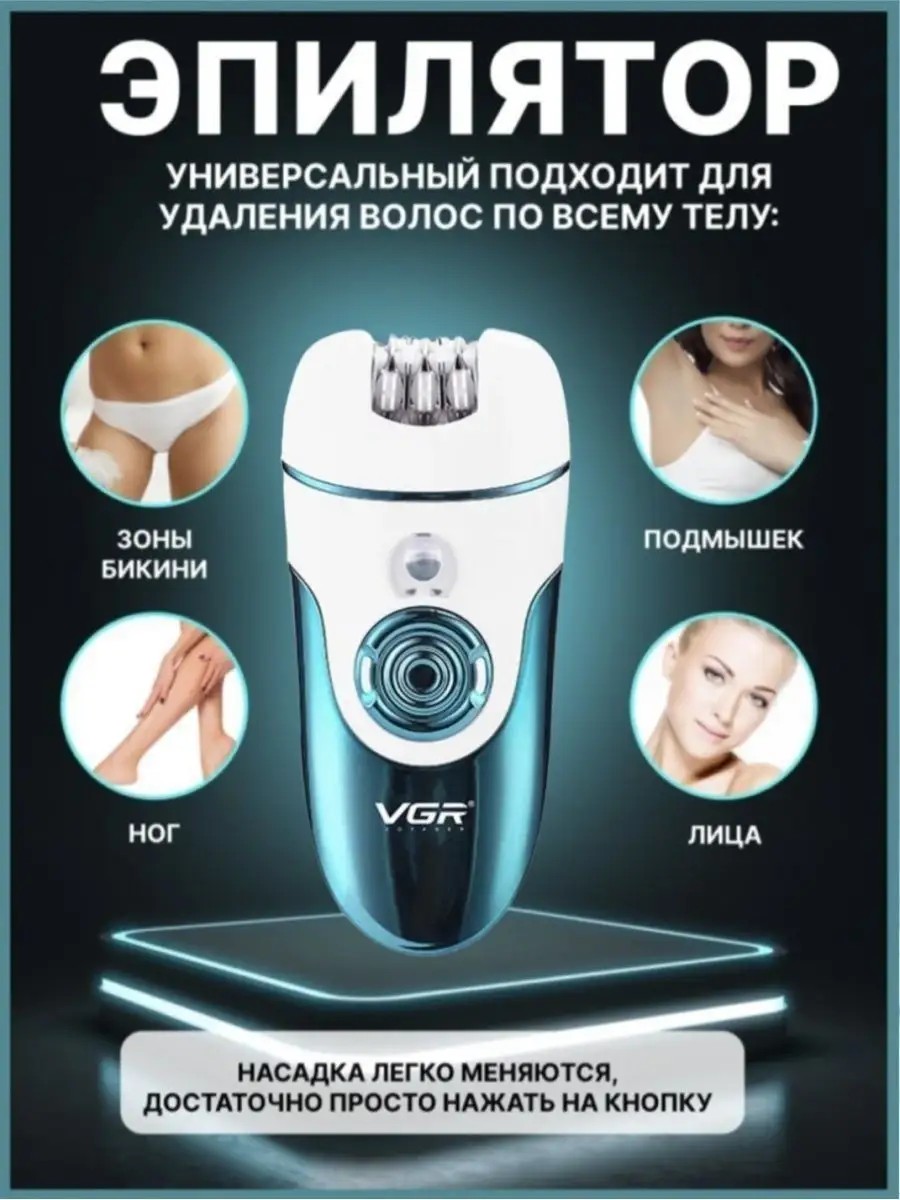 Эпилятор 4 в 1 модели от VGR создан для идеальной эпиляции и шелковистой, гладкой кожи. Эргономичный дизайн позволяет удобно держать депилятор женский электрический в руке. Бритвенный станок женский очень легок и прост в работе, что обеспечивает более легкие и точные движения - хороший выбор для удаления волос в труднодоступных зонах. Женский эпилятор работает от встроенного аккумулятора. Время работы при полном заряде - до 50 минут. Время зарядки аккумулятора - 20 часов. Особенностью данной модели является поддержка USB зарядки (USB-кабель входит в комплект). На передней части эпилятора расположен фонарик, что позволяет лучше видеть место удаления волос и использовать прибор в любое время суток. Эпилятором легко удалять волоски на лице и теле, подмышками, на ногах и в зоне бикини, делать интимный пилинг. Для депиляции бикини данная модель женской электробритвы отлично подходит. Триммер для бикини за счет дополнительной насадки также можно использовать как пемзу для ног.
