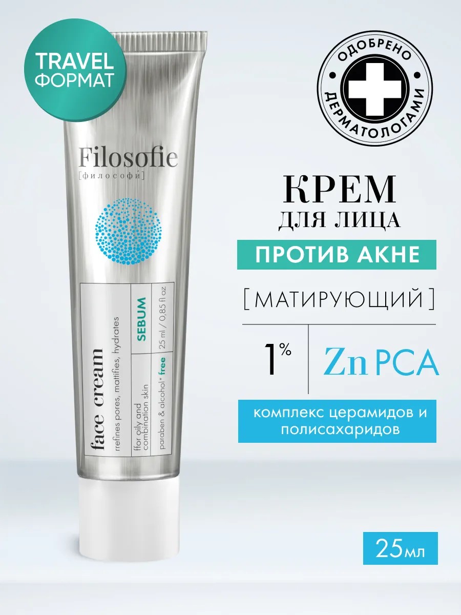 Крем для лица от FILOSOFIE - средство, специально созданное для ухода за жирной и комбинированной кожей, склонной к появлению акне и прыщей у подростков, девушек, женщин, парней и мужчин. Матирующий крем разработан по уникальной формуле, богатой активными компонентами, которые обеспечивают комплексный уход за проблемной кожей, sos (сос) помощник от подкожных прыщей, против угрей и угревой сыпи, пигментных пятен, воспалений и высыпаний. В составе есть цинк, который помогает увлажнить и одновременно подсушить кожу, снизить выработку себума и регулировать работу сальных желез, что особенно важно для жирной кожи. Также в состав входит комплекс полисахаридов и ниацинамид (в три раза эффективней чем салициловая кислота), которые помогают снять воспаление и сократить появление акне и устранить следы постакне. Он питает кожу, увлажняет ее и защищает от негативных внешних факторов, в 10 раз эффективней чем цинковая мазь или молочная кислота. Питательный крем, не содержит масло, матирует кожу, сужает поры, уменьшает черные точки и выравнивает тон, успокаивает, уменьшает покраснения, шелушения и раздражения, подходит к использованию как точечный крем, эффективен при лечении угревой болезни. Его легкая текстура позволяет использовать его до, после и под макияж, как восстанавливающий женский крем, не забивая поры, не вызывает появление новых комедонов. Косметический крем паста успокаивает воспаленную кожу, способствует восстановлению и регенерации тканей. Увлажняющий, защитный дерматологический крем является некомедогенным, он не забивает поры и не вызывает появление новых прыщей. Можно использовать как дневной, так и ночной крем, для молодой и возрастной кожи. FILOSOFIE - бренд профессиональной уходовой косметики в концепции clean beauty, при которой используются средства только натурального происхождения, отличный подарок себе и близким, лечебная косметика для всей семьи. "Чистая косметика" - без синтетических компонентов.