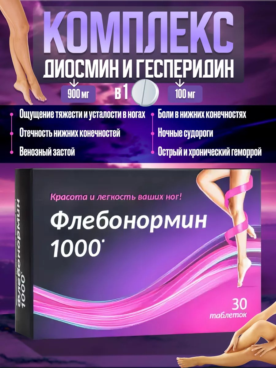 Venotonic Phlebonormine 1000 is a complex for maintaining healthy veins based on the bioflavonoids hesperidin and diosmin. It helps prevent and relieve the main symptoms of venous insufficiency – pain, swelling, heaviness. Phlebonormine 1000 is recommended for: a feeling of heaviness and fatigue in the legs; swelling of the lower extremities; increased vein distensibility; venous congestion; pain in the lower extremities; night cramps; acute and chronic hemorrhoids. The main active components of the complex – hesperidin and diosmin – are natural compounds found in citrus fruits. They are included in many medications for the treatment of varicose veins of the lower extremities and hemorrhoids. Hesperidin neutralizes the action of free radicals, helps reduce spasms and prevent vascular diseases. Diosmin is a phlebotonic that improves lymphatic drainage and microcirculation. Hesperidin and diosmin have a synergistic effect: they provide a venotonic effect (reducing venous distensibility and increasing venous tone). They improve lymphatic drainage (increasing lymphatic capillary tone and reducing lymphatic pressure). They help strengthen the walls of blood vessels. They improve microcirculation and have an anti-inflammatory effect. Recommended as an additional source of hesperidin and diosmin to maintain the functional activity of the venous and lymphatic systems of the body. Biologically active components per tablet: diosmin 900 mg and hesperidin 100 mg. Available as: 1.6 g film-coated tablets.
