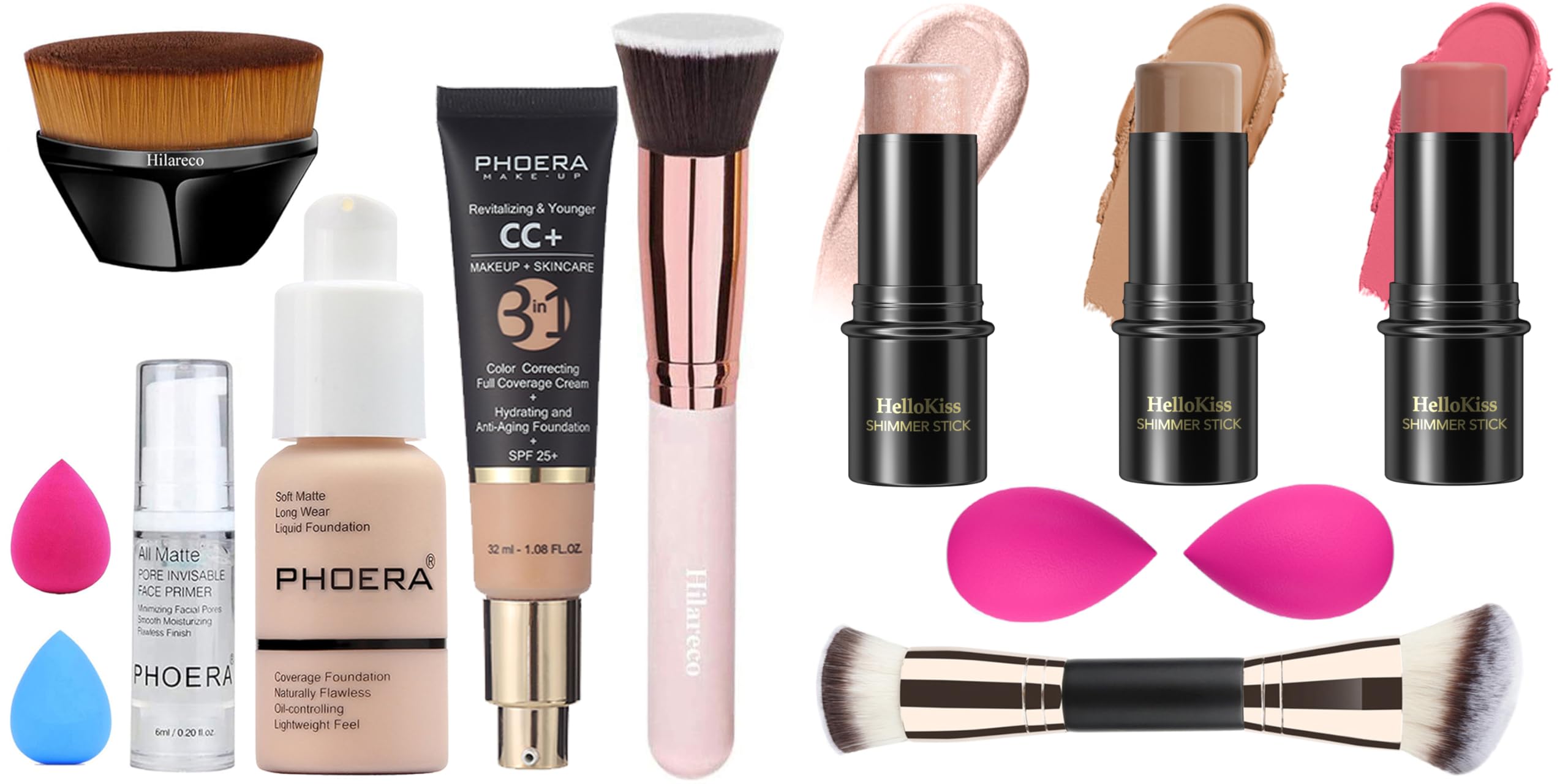 ? Comes with Double-Ended Makeup Brush Our contour stick set comes with a premium soft double-ended makeup brush for blending stick cream, it can help you create a professional makeup look easily. ? High Quality Paste Long-Lasting Waterproof This beauty cream stick has a fine texture and is highly blendable and buildable. The innovative waterproof formula won't cake or clog pores, ensuring your makeup lasts all day without smudging or fading with sweat, keeping your makeup looking flawless all day long. ? Contour Stick Makeup Kit This contour stick makeup kit has shades that include blush, bronzer contour and highlighter. This kit can help you create three-dimensional makeup, and the combination of four colors allows you to create a charming combination of light and shadow on the skin. Contour your face for a flattering look. ? Full Coverage Foundation: - Lightweight, waterproof and highly pigmented, instantly hides blemishes .Provides matte coverage that stays true up to 24 hours. ? PHOERA CC Cream: - is a full-coverage foundation, hydrating anti-aging serum, broad-spectrum physical sunscreen, brightening color corrector, poreless-finish primer, dark spot concealer and moisturizing day cream.