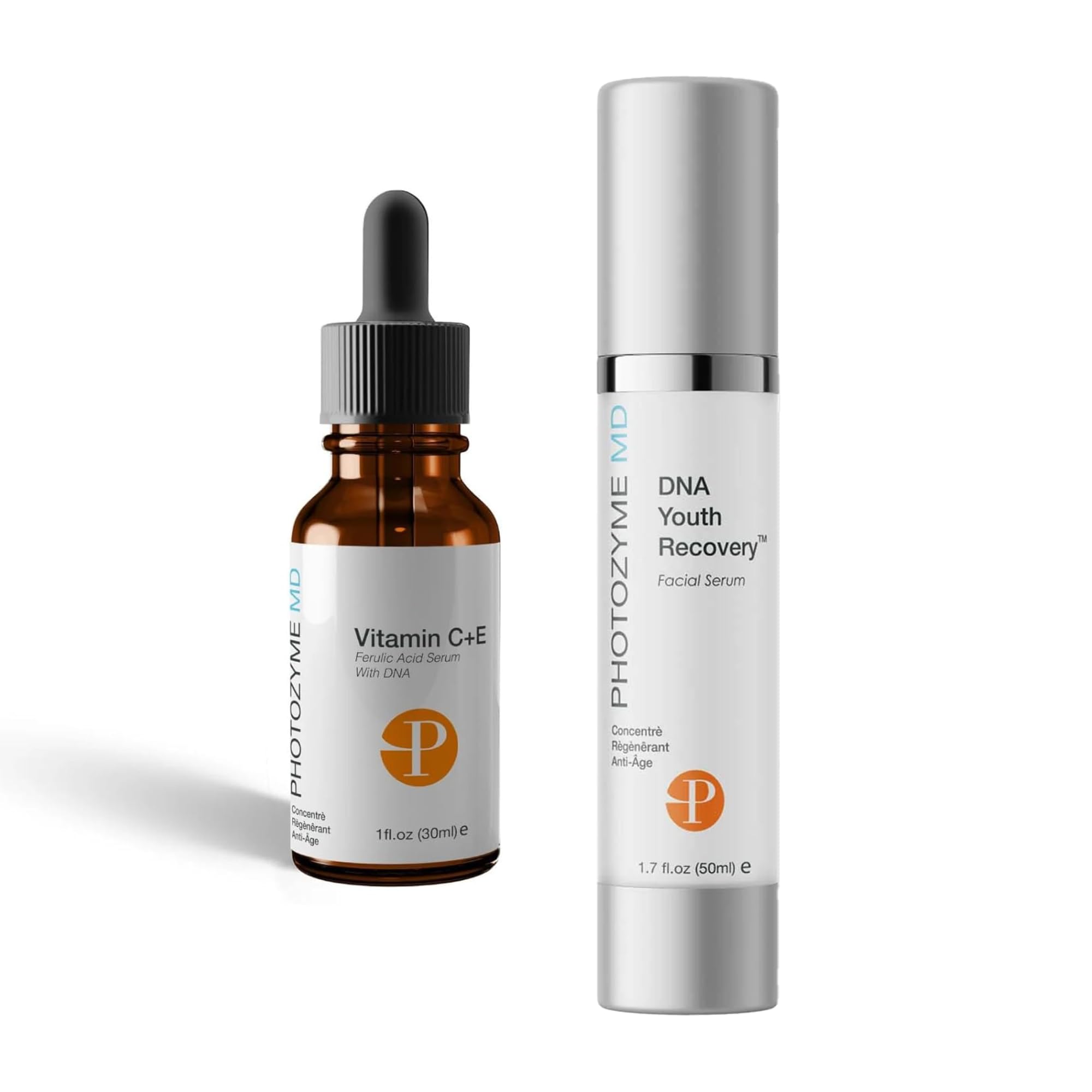 Brighten, repair, and renew your complexion with the Photozyme Vitamin C Serum and DNA Youth Recovery Serum bundle—an advanced dual-step system designed to defend against aging while restoring youthful radiance. The Vitamin C Serum is powered by a potent 15 concentration of pure Vitamin C, clinically shown to stimulate collagen production for firmer, smoother skin. This revitalizing formula works to reduce the appearance of wrinkles and fine lines while fading dark spots, discoloration, and sun damage. Infused with Vitamin E and ferulic acid, it enhances antioxidant protection, neutralizing free radicals and improving overall skin tone and luminosity. The result is visibly brighter, more even, and youthful-looking skin that glows with health and vitality. To complement this surface-level renewal, the DNA Youth Recovery Serum delivers deep cellular repair. Featuring three advanced DNA Repair Enzymes, this innovative serum works at the source of visible aging—correcting sun-induced DNA damage and preventing future harm. With consistent use, it helps reduce fine lines, UV spots, and loss of firmness while improving skin texture and resilience. Enriched with hyaluronic acid for deep hydration and a powerful antioxidant complex, it replenishes moisture, plumps the skin, and defends against daily environmental stressors. Together, these two formulas deliver a comprehensive approach to anti-aging and skin health: the Vitamin C Serum protects and brightens, while the DNA Youth Recovery Serum repairs and strengthens. Used morning and evening, this synergistic duo promotes visibly firmer, more luminous, and youthful skin over time. For best results, apply Vitamin C Serum in the morning to energize and protect your complexion, followed by DNA Youth Recovery Serum to enhance repair and hydration. Always finish with a broad-spectrum sunscreen during the day to maintain long-lasting results. The Photozyme Vitamin C DNA Youth bundle is your daily defense against dullness,DAY NIGHT SKINCARE DUO: Apply Vitamin C Serum in the morning to brighten and protect follow with DNA Youth Serum daily to repair, hydrate, and strengthen skin. HYDRATION ANTIOXIDANT DEFENSE: Hyaluronic acid, Vitamin E, and ferulic acid deliver deep hydration and protection from free radicals and environmental stressors. DNA-LEVEL REPAIR: DNA Youth Recovery Serum supports cellular repair to help reverse visible sun damage and protect against future aging. COLLAGEN FIRMNESS BOOST: Vitamin C helps stimulate collagen production, improving elasticity and minimizing fine lines for smoother, firmer skin. BRIGHTEN RESTORE: Combines 15 Vitamin C with DNA Repair Enzymes to target dullness, dark spots, and visible sun damage for a radiant, even-toned complexion.