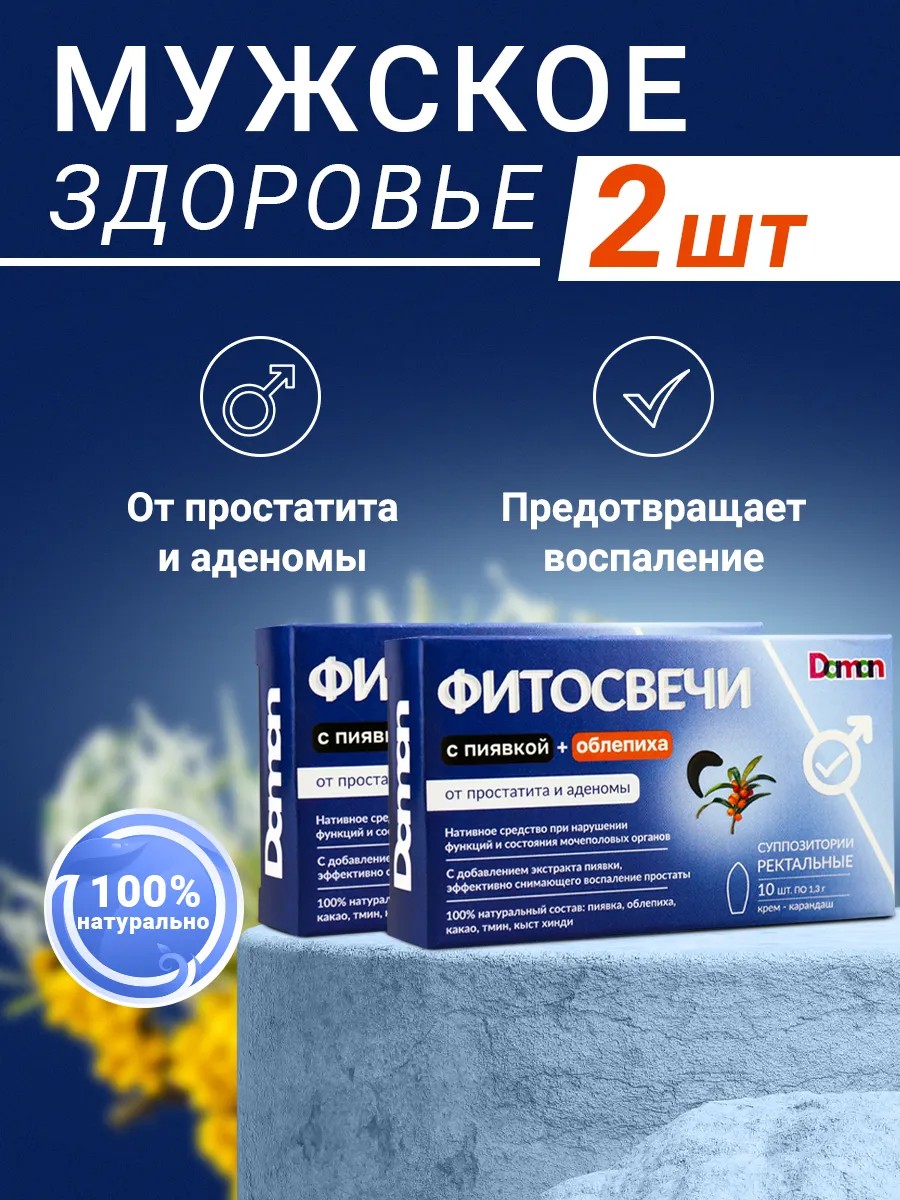 Natural phyto-suppositories "Daman" with cocoa butter, black cumin, sea buckthorn, olives, kista al-Hindi, nettle extracts, pumpkin seeds, and leech are used for inflammatory diseases of the pelvic organs in men.