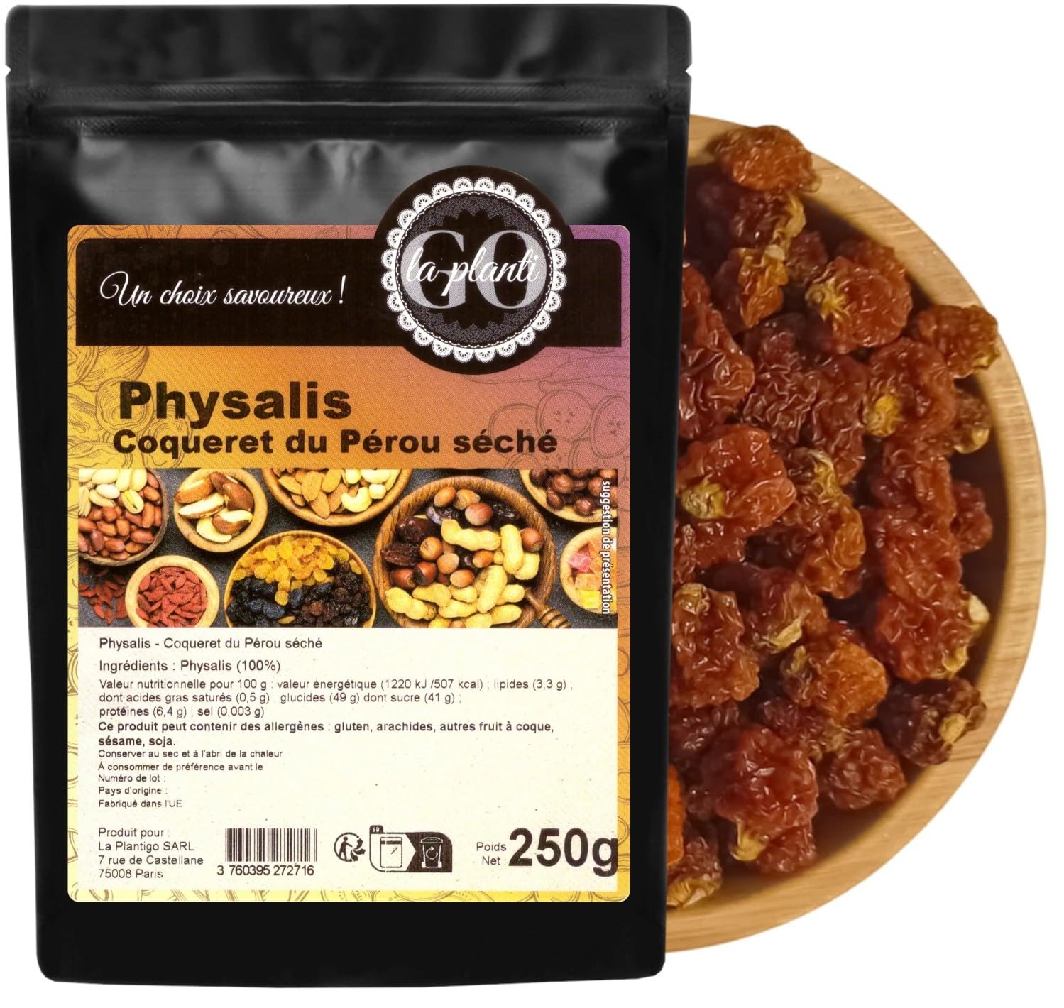 Ingredients: Dried Cape gooseberry (100 ) Nutritional values per 100g: Energy – 1220 kJ 507 kcal Fat – 3.3g of which saturates – 0.5g Carbohydrate – 49g of which sugars – 41g Protein – 6.4g Salt – 0.003g Nutritional values were calculated from raw material databases and specifications. Individual batches may vary slightly. Allergen information: This product may contain the following allergens: gluten, peanuts, tree nuts, sesame, soy. Packaging method: The product is packaged in thick doypack-type pouches. The packaging has a heat-sealed drawstring closure, allowing for easy opening and resealing multiple times. Thanks to this simple technology, the product retains its freshness. Its organoleptic properties remain unchanged throughout its shelf life. Thanks to high sales volumes and our stock turnover, LA PLANTIGO products are always fresh, making them ideal for bulk purchases and stocking up on food in your home pantry. Ingredients: Dried Cape gooseberry (100 )It can replace raisins or cranberries in vegetable or raw vegetable salads. It also works well in fruit salads as well as those with arugula, walnuts, and blue cheese. It's an excellent ingredient for cheese and charcuterie boards. It can be used in the preparation of meat dishes, especially those made with poultry or pork, giving them a more unique flavor. It can also be added to sauces, chutneys, and marinades. It enriches smoothies, giving them a slightly tart, fruity taste. It's perfect in porridges, granolas, mueslis, as well as in plain yogurt or kefir. Dried Cape gooseberry is an exceptional superfruit with an intensely tangy flavor. It's an excellent ingredient in many dishes, adding an exotic touch and valuable nutrients. Ideas for using it in cooking:Description du produit Ingrédients : Coqueret du Pérou séché (100 ) Valeurs nutritionnelles pour 100 g: Valeur énergétique –1220 kJ 507 kcal Lipides – 3,3 g Dont acides gras saturés - 0,5 g Glucides – 49 g Dont sucres - 41 g Protéines – 6,4 g Sel – 0,003 g Les valeurs nutritionnelles ont été calculées à partir de base de données et spécifications de matières premières. Les lots individuels peuvent varier légèrement. Information sur allergènes : Ce produit peut contenir les allergènes : gluten, arachides, fruit à coque, sésame, soja. Méthode d'emballage : Le produit est emballé dans des sachets épais de type « doypack ». L'emballage a une fermeture à cordon soudé, ce qui permet l'ouverture et la fermeture facile plusieurs fois. Grâce à cette technologie simple le produit garde sa fraicheur. Ses propriétés organoleptiques ne changent pas pendant toute la durée de conservation. Grâce aux volumes de ventes important et la rotation de nos stocks, les produits LA PLANTIGO sont toujours frais, ce qui favorise les achats en gros et le stockage des aliments dans le garde-manger à la maison. Ingrédients Coqueret du Pérou séché (100 )Il peut remplacer les raisins secs ou les cranberries dans les salades de légumes ou de crudités. Il fait ses preuves aussi bien dans les salades de fruits que dans celles avec de la roquette, des noix et du fromage bleu. C'est un excellent ingrédient des plateaux de fromage et de charcuterie. Il peut être utilisé dans la préparation des plats de viande, notamment à base de volaille ou de porc, en rendant leur saveur plus originale. Il peut également être ajouté aux sauces, aux chutneys et aux marinades. Il enrichit les smoothies en leur conférant un goût fruité légèrement acidulé. Il est parfait dans les porridges, les granolas, les mueslis, ainsi que dans les yaourts nature ou les kéfirs. Le coqueret du Pérou séché est un superfruit exceptionnel au goût acidulé intense. C'est un excellent ingrédient de nombreux plats, leur apportant une note exotique et de précieux éléments nutritifs. Idées de son utilisation en cuisine:.Physalis - Coqueret du Pérou séché 250 g - LA PLANTIGO