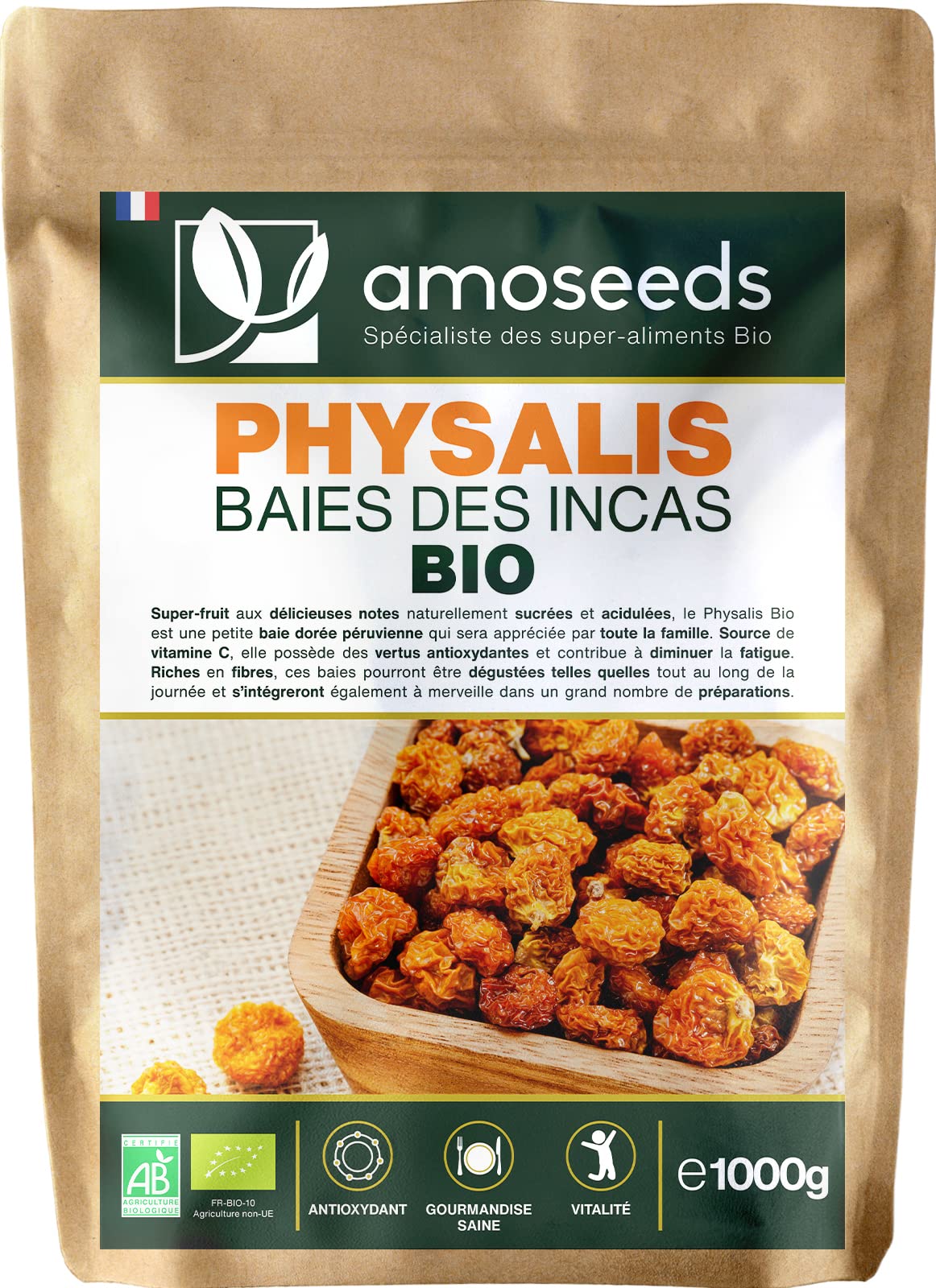 ✓ CERTIFIED ORGANIC: Resealable and recyclable Kraft bag of 1kg of amoseeds Premium Quality dried organic physalis. 100 natural, pure, vegan product, no added sugars, no additives, no preservatives, no GMOs, no pesticides, no artificial colors, no lactose, no soy and no gluten. Each batch is tested by third parties to ensure their quality and purity. ✓ IMMUNITY: Our organic Physalis helps maintain good immune defenses thanks to their antioxidant power. By enjoying a handful a day, you will provide your body with a significant amount of vitamin C, which will help strengthen your body against external attacks. This organic superfood will therefore be particularly interesting during seasonal changes or loss of tone. ✓ ANTIOXIDANT, COLLAGEN: thanks to their richness in vitamin C, almost identical to that of oranges, our Organic Physalis help protect the body from the oxidative stress that weakens it. This natural antioxidant also promotes the formation of collagen, an essential molecule for ensuring the good health of joints, bones, cartilage and skin. ✓ VITALITY, ANTI-FATIGUE: thanks to their concentration in vitamin C (26 ), our Organic Physalis help reduce fatigue, while helping to increase vitality. They are therefore perfectly suited to people who want to regain their energy, athletes who are looking for a natural snack to enjoy before, during or after exercise, or people who want a healthy snack, easy to take away!. ✓ HEALTHY SNACKS: sources of vitamin C and rich in vitamins A and B, our Organic Physalis provide essential nutrients to the body to keep it in great shape. They are ideal eaten as is, as a snack, or added to pastries, desserts, and savory dishes. Their naturally sweet and tangy flavor will delight the taste buds of young and old alike!✓ CERTIFIÉS BIOLOGIQUES : sachet Kraft refermable et recyclable de 1kg de physalis Bio séchés de Qualité Supérieure amoseeds. Produit 100 naturel, pur, vegan, sans sucres ajoutés, sans additif, sans conservateur, sans OGM, sans pesticides, sans colorant artificiel, sans lactose, sans soja et sans gluten. Chaque lot est testé par des tiers afin de s'assurer de leur qualité et leur pureté. ✓ IMMUNITÉ : nos Physalis Bio participent au maintien de bonnes défenses immunitaires grâce à leur pouvoir antioxydant. En dégustant une poignée par jour, vous apporterez à votre corps une quantité intéressante de vitamine C, ce qui vous aidera à renforcer votre organisme face aux attaques extérieures. Ce super-aliment Bio sera donc particulièrement intéressant lors de changements de saison ou de perte de tonus. ✓ ANTIOXYDANT, COLLAGÈNE : grâce à leur richesse en vitamine C presque identique à celle de l'orange, nos Physalis Bio contribuent à protéger le corps du stress oxydatif qui le fragilise. Cet antioxydant naturel favorise également la formation de collagène, une molécule essentielle pour garantir la bonne santé des articulations, des os, des cartilages et de la peau. ✓ VITALITÉ, ANTI-FATIGUE : grâce à leur concentration en vitamine C (26 ), nos Physalis Bio aident à réduire la fatigue, tout en contribuant à augmenter la vitalité. Ils sont par conséquent tout à fait adaptés aux personnes qui souhaitent retrouver du tonus, les sportifs qui recherchent une collation naturelle à déguster avant, pendant ou après l'effort, ou encore les personnes qui désirent un encas sain, facile à emporter !. ✓ ENCAS SAINS : sources de vitamine C et riches en vitamines A et B, nos Physalis Bio apportent des nutriments essentiels au corps pour le conserver en pleine forme. Ils seront idéaux dégustés tels quels, en guise d'encas, ou ajoutés dans des pâtisseries, desserts et préparations salées. Leur goût naturellement sucré et acidulé ravira les papilles des petits et des grands !.