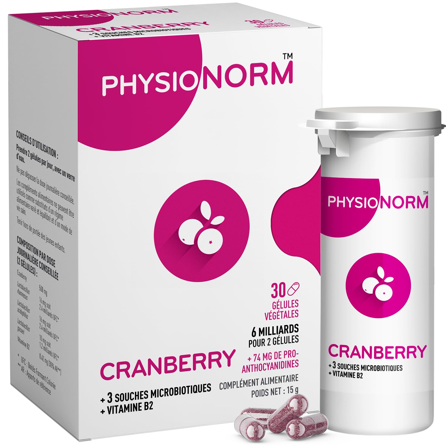Physionorm Cranberry - Complement Alimentaire pour Femme Contre Infections Urinaires - Renforce la Flore Intestinale - Probiotique, Ferments Lactiques Vitamine B2-30 gélules
