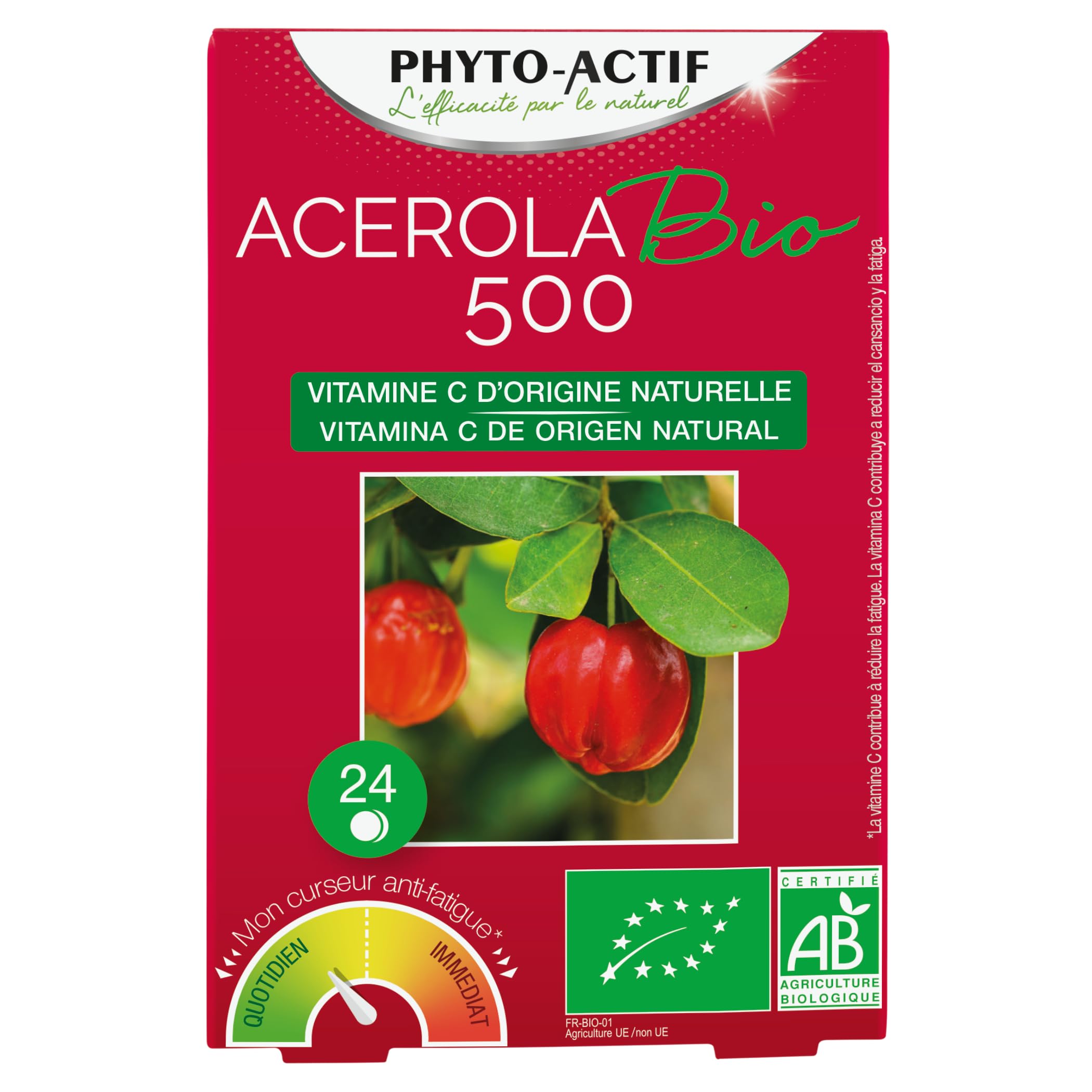: 100 Natural Vitamin C from Organic Acerola. Ingredients: Whole cane sugar , corn maltodextrin , acerola berries , lemon peel , natural cherry flavoring, anti-caking agent: magnesium carbonate, rosehip berries , natural lemon flavoring ( ingredient from organic farming)CONTENTS PHYTO-ACTIF Organic Acerola 500 1 x 24 tablets. DIRECTIONS FOR USE 1 chewable tablet per day. This product is a food supplement and should not replace a varied and balanced diet and a healthy lifestyle. Do not exceed the stated daily dose. PHYTO-ACTIF LABORATORY Phyto-Actif Laboratory, a French manufacturer dedicated to well-being and health for over 30 years. Creating, manufacturing, and distributing a range of high-quality natural and or organic products inspired by plants. ACEROLA Acerola is a small cherry native to South America with a particularly pleasant and unique tangy flavor, and is best known for being very rich in vitamin C. This fruit is the key ingredient in this food supplement, combined with rosehip and sweet orange extracts, both of which have a high bioflavonoid content. ORGANIC ACEROLA 500 Thanks to its high natural vitamin C content, Organic Acerola 500 provides more than 100 of the recommended daily intake in a single tablet. Vitamin C helps reduce fatigue, supports the normal function of the immune system, and increases iron absorption. Certified organic (AB) and organic by Europe, gluten-free, this food supplement, containing 500 mg of acerola, is suitable for vegetarians.Description du produit Vitamine C d'origine 100 naturelle issue de l'Acérola biologique Ingrédients Sucre de canne complet , maltodextrine de Maïs , baies d'Acérola , écorces de Citron , arôme Cerise naturel, anti-agglomérant: carbonate de magnésium, baies de Cynorrhodon , arôme naturel de citron ( ingrédient issu de l'agriculture biologique)CONTENU PHYTO-ACTIF Acérola Bio 500 1 x 24 comprimés. CONSEILS D'UTILISATION 1 comprimé à croquer par jour. Ce produit est un complément alimentaire et ne se substitue pas à une alimentation variée et équilibrée et à un mode de vie sain. Il est déconseillé de dépasser la dose journalière indiquée. LABORATOIRE PHYTO-ACTIF Laboratoire Phyto-Actif, fabricant français au service du bien-être et de la santé depuis plus de 30 ans. Créer, fabriquer et distribuer une gamme de produits naturels et ou biologiques de haute qualité, inspiré du végétal. ACÉROLA L'acérola est une petite cerise originaire d'Amérique du Sud qui jouit d'un goût acidulé particulièrement agréable et atypique, et qui est surtout connue pour être d'une grande richesse en vitamine C. Ce fruit figure au cœur de la composition de ce complément alimentaire, et est associé à des extraits de cynorrhodon ainsi qu'à des extraits d'oranger doux qui ont une forte teneur en bioflavonoïdes. ACÉROLA BIO 500 De part sa richesse en Vitamine C naturelle, Acérola Bio 500 apporte plus de 100 des valeurs nutritionnelles de référence en un seul comprimé. La Vitamine C contribue à réduire la fatigue, au fonctionnement normal du système immunitaire et accroît l'absorption de fer. Certifié AB et Bio Europe, sans gluten, ce complément alimentaire, contenant 500 mg d'Acérola, convient aux végétariens.PHYTO-ACTIF Acérola Bio 500 Complément alimentaire Vitalité Bio Réduit la fatigue Immunité Vitamine C 500 mg d'Acérola 24 comprimés