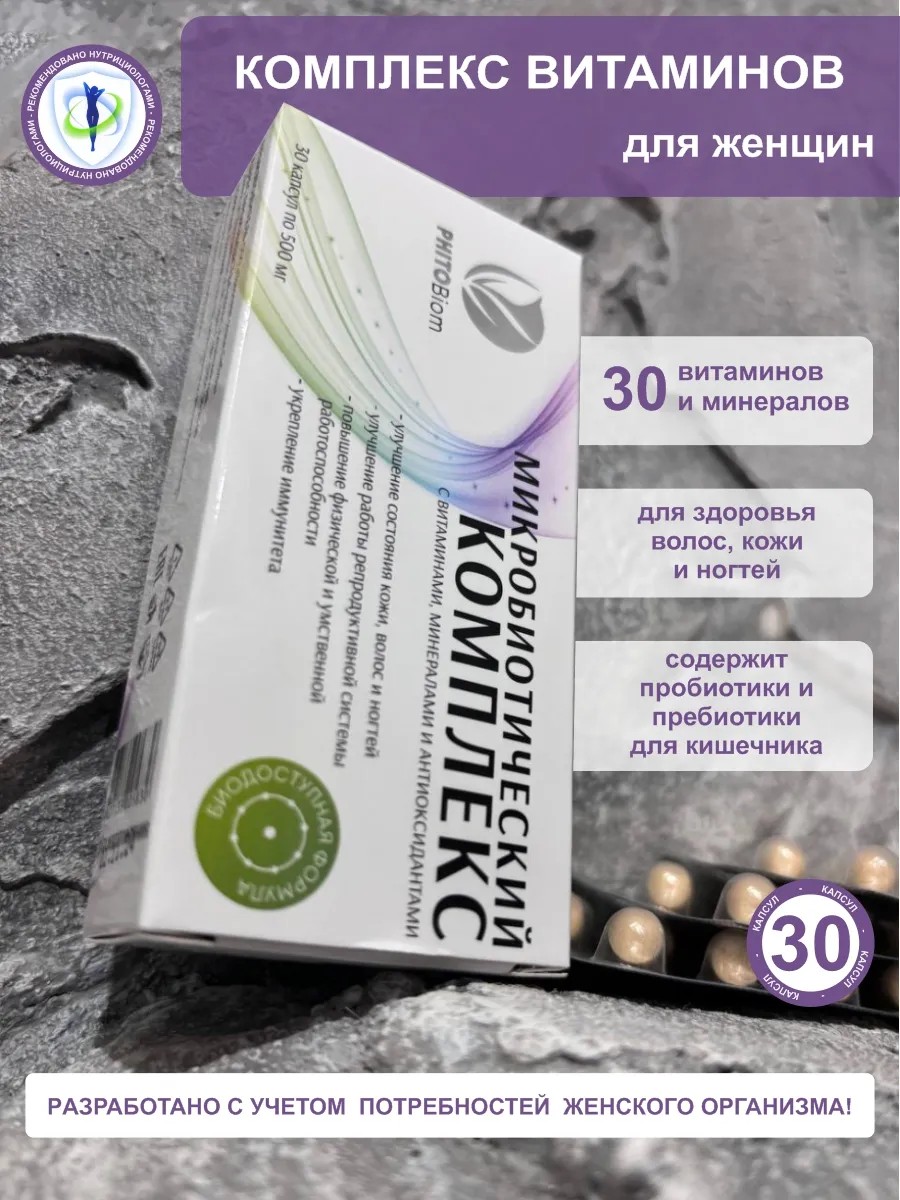 Витамины для женщин Phitobiom — это уникальный микробиотический комплекс, разработанный с учетом всех потребностей женского организма. Каждый компонент в составе направлен на поддержание красоты, здоровья и самочувствия. Содержит пребиотики и пробиотики, которые улучшают работу кишечника, поддерживают иммунитет и способствуют общему оздоровлению. Антиоксиданты в сочетании с коллагеном улучшают состояние кожи, делают ее более упругой и эластичной, а также помогают справиться с мелкими морщинами.