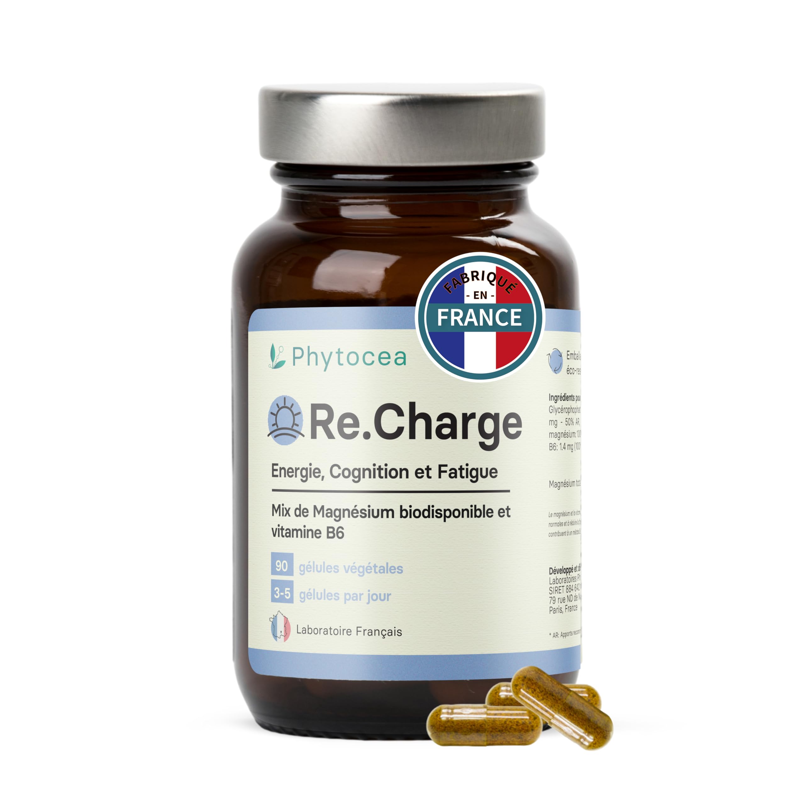 ? MADE IN FRANCE WITH PREMIUM INGREDIENTS: Formulated and tested in France according to the strictest pharmaceutical standards with a formulation validated by an independent scientific council, Re.Charge is guaranteed GMO-free, gluten-free, with traceable ingredients and a vegetable shell. Perfect for vegetarians and vegans. Flexible treatment according to your needs: 3 capsules per day with a glass of water. SUITABLE FOR ATHLETES AND ACTIVE ADULTS: Intensive physical efforts increase magnesium requirements. Re.Charge is ideal for supporting sports bodybuilding sessions, muscle recovery, preventing cramps and promoting relaxation. A natural solution for any man or woman wishing to stay efficient and avoid deficiencies thanks to essential vitamins. ? DAILY ENERGY AND PERFORMANCE: Re.Charge helps maintain a stable energy level while reducing feelings of physical and mental fatigue. Ideal for supporting your intense days, it promotes recovery after exercise and improves concentration, for a clear mind and a body in great shape. MAGNESIUM AND VITAMIN B6 - THE ANTI-STRESS DUO: Re.Charge combines magnesium with vitamin B6 for enhanced effectiveness. This essential duo reduces anxiety, soothes stress and anxiety and fights fatigue, while promoting the proper functioning of the nervous system. Ideal multivitamin supplement to regain calm and emotional balance during periods of overwork. COMPLEMENTARY MAGNESIUM DUO - OPTIMAL ABSORPTION: Re.Charge combines two premium forms of magnesium, glycerophosphate and pidolate, known for their excellent absorption and digestive gentleness like magnesium bisglycinate. Unlike marine magnesium or citrate, these forms effectively fill deficiencies without causing side effects. Ideal for supporting the nervous, muscular and energy systems.? FABRIQUÉ EN FRANCE AVEC DES INGRÉDIENTS PREMIUM : Formulé et testé en France selon les normes pharmaceutiques les plus strictes avec une formulation validée par un conseil scientifique indépendant, Re.Charge est garanti sans OGM, sans gluten, avec des ingrédients traçables et une enveloppe végétale. Parfait pour les végétariens et végétaliens. Cure flexible selon vos besoins : 3 gélules par jour avec un verre d'eau. ADAPTÉ AUX SPORTIFS ET ADULTES ACTIFS : Les efforts physiques intensifs augmentent les besoins en magnésium. Re.Charge est idéal pour soutenir les séances de sport musculation, la récupération musculaire, prévenir les crampes et favoriser la relaxation. Une solution naturelle pour tout homme ou femme souhaitant rester performant et éviter les carences grâce à des vitamines essentielles. ? ÉNERGIE ET PERFORMANCE AU QUOTIDIEN : Re.Charge aide à maintenir un niveau d'énergie stable tout en réduisant les sensations de fatigue physique et mentale. Idéal pour soutenir vos journées intenses, il favorise la récupération après l'effort et améliore la concentration, pour un esprit clair et un corps en pleine forme. MAGNÉSIUM ET VITAMINE B6 - LE DUO ANTI-STRESS : Re.Charge associe du magnésium avec de la vitamine B6 pour une efficacité renforcée. Ce duo essentiel réduit l'anxiété, apaise stress et angoisse et combat la fatigue, tout en favorisant le bon fonctionnement du système nerveux. Complement multi vitamines idéal pour retrouver calme et équilibre émotionnel pendant les périodes de surmenage. DUO DE MAGNÉSIUM COMPLEMENTAIRES - ABSORPTION OPTIMALE : Re.Charge associe deux formes de magnésium premium, le glycérophosphate et le pidolate reconnues pour leur excellente absorption et leur douceur digestive comme le magnesium bisglycinate. Contrairement au magnésium marin ou citrate, ces formes comblent efficacement les carences sans provoquer d'effets secondaires. Idéal pour soutenir le système nerveux, musculaire et énergétique.