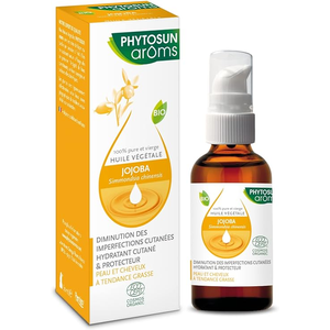 Phytosun Arôms Organic Jojoba Vegetable Oil - 100 Pure and Virgin - Reduction of skin imperfections, Skin moisturizer and Protector - 50ml NATURALLY EFFECTIVE Phytosun Arôms Organic Jojoba Vegetable Oil is a vegetable oil with many benefits that reduces skin imperfections in oily skin . It hydrates the upper layers of the epidermis. It protects oily skin and hair. Fluid and soft texture, rapid absorption. Suitable for pregnant women and babies. Dermatologically tested. Clinical test on the reduction of skin imperfections after 28 days of use Directions for use: Face, body and hair. To use pure. Can also be used to dilute Phytosun Arôms Essential Oil for skin use. In this case, follow the instructions for use on the Essential Oil packaging. Before manufacturing your cosmetic product, find the preparation and labeling instructions on our website. Precautions for use: External use only. Do not apply to damaged skin. Mixtures of an essential oil in a vegetable oil are not recommended for pregnant or breastfeeding women and babies. Store away from light and heat in a tightly closed bottle. Jojoba Vegetable Oil can freeze below 15 C. Ingredients: Simmondsia chinensis Seed Oil . Ingredient from Organic Farming If you have any questions about our product, adverse effects or quality defects, contact us directly via the Perrigo France website. Only the list on the product label is authentic. Be sure to read the information on the product packaging, especially if you are at risk of allergies. INGREDIENTS Simmondsia chinensis seed oil ingredient from organic farming. DIRECTIONS FOR USE Face, body and hair. To use pure. Can also be used to dilute Phytosun Arôms Essential Oil for skin use. In this case, follow the instructions for use on the Essential Oil packaging. Before manufacturing your cosmetic product, find the preparation and labeling instructions on our website. SAFETY WARNING External use only. Do not apply to damaged skin. Mixtures of an essential oil in a vegetable oil are not recommended for pregnant or breastfeeding women and babies. PHYTOSUN ARÔMS EXPERTISE: Phytosun Arôms Vegetable Oils are naturally extracted by cold pressing. They are not refined in order to preserve the integrity of their constituents, their synergies and their beneficial effects. Clinical test on the reduction of skin imperfections after 28 days of use. INGREDIENT: Simmondsia chinensis seed oil ingredient from organic farming. Producing organ: seeds. HYDRATES, PROTECTS: Its soft and fluid texture moisturizes body and face. It protects oily skin and hair. REDUCES IMPERFECTIONS: Phytosun Arôms Organic Jojoba Vegetable Oil reduces skin imperfections in oily skin . Phytosun Arôms Huile Végétale de Jojoba Bio - 100 Pure et Vierge - Diminution des imperfections cutanées, Hydratant cutané et Protecteur - 50ml NATURELLEMENT EFFICACE L'Huile Végétale de Jojoba Bio Phytosun Arôms est une huile végétale aux nombreux bienfaits qui réduit les imperfections cutanées des peaux grasses . Elle hydrate les couches supérieures de l'épiderme. Elle protège les peaux et les cheveux à tendance grasse. Texture fluide et douce, absorption rapide. Convient aux femmes enceintes et aux bébés. Testé sous contrôle dermatologique. Test clinique sur la diminution des imperfections cutanées après 28 jours d'utilisation Conseils d'utilisation : Visage, corps et cheveux. À utiliser pure. Peut être également utilisée pour diluer une Huile Essentielle Phytosun Arôms à usage cutané. Dans ce cas, respecter les conseils d'utilisation sur l'emballage de l'Huile Essentielle. Avant de fabriquer votre produit cosmétique, retrouvez sur notre site internet les instructions de préparation et d'étiquetage. Précautions d'emploi : Usage externe uniquement. Ne pas appliquer sur les peaux lésées. Les mélanges d'une huile essentielle dans une huile végétale sont déconseillés aux femmes enceintes, qui allaitent et aux bébés. À conserver à l'abri de la lumière et de la chaleur dans un flacon bien fermé. L'Huile Végétale de Jojoba peut se figer en-dessous de 15 C. Ingrédients : Simmondsia chinensis Seed Oil . Ingrédient issu de l'Agriculture Biologique En cas de question sur notre produit, d'effet indésirable ou de défaut de qualité, contactez-nous directement via le site internet Perrigo France. Seule la liste figurant sur l'étiquette du produit fait foi. Veillez à prendre connaissance des informations figurant sur l'emballage du produit, notamment si vous présentez des risques d'allergie. INGRÉDIENTS Simmondsia chinensis seed oil ingrédient issu de l'agriculture biologique. MODE D'EMPLOI Visage, corps et cheveux. À utiliser pure. Peut être également utilisée pour diluer une Huile Essentielle Phytosun Arôms à usage cutané. Dans ce cas, respecter les conseils d'utilisation sur l'emballage de l'Huile Essentielle. Avant de fabriquer votre produit cosmétique, retrouvez sur notre site internet les instructions de préparation et d'étiquetage. AVERTISSEMENT DE SÛRETÉ Usage externe uniquement. Ne pas appliquer sur les peaux lésées. Les mélanges d'une huile essentielle dans une huile végétale sont déconseillés aux femmes enceintes, qui allaitent et aux bébés L'EXPERTISE PHYTOSUN ARÔMS : Les Huiles Végétales Phytosun Arôms sont extraites de façon naturelle par pression à froid. Elles ne subissent aucun raffinage afin de préserver l'intégrité de leurs constituants, de leurs synergies et de leurs effets bénéfiques. Test clinique sur la diminution des imperfections cutanées après 28 jours d'utilisation. INGREDIENT : Simmondsia chinensis seed oil ingrédient issu de l'agriculture biologique. Organe producteur : graines. HYDRATE, PROTÈGE : Sa texture douce et fluide hydrate corps et visage. Elle protège les peaux et les cheveux à tendance grasse. DIMINUTION DES IMPERFECTIONS : L'Huile Végétale de Jojoba Bio Phytosun Arôms réduit les imperfections cutanées des peaux grasses .