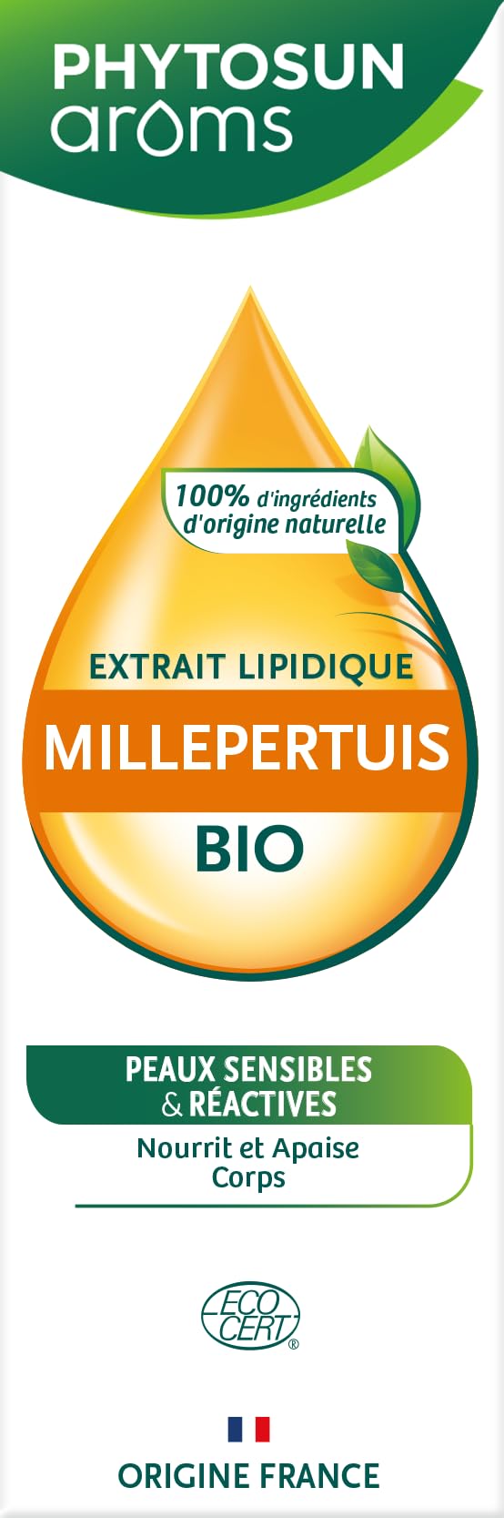 Phytosun Arôms Organic St. John's Wort Lipid Extract - Nourishing and Soothing - Ideal for Reactive and Sensitive Skin - 50ml Phytosun Arôms Organic St. John's Wort Lipid Extract is gentle on reactive and sensitive skin, helping to nourish and soothe it, leaving it comfortable and supple. It helps repair sensitized and irritated skin. Suitable for pregnant women and babies. Dermatologically tested. Directions for use: Lipid Extract for face and body. Use undiluted. Can be used to dilute a Phytosun Arôms Essential Oil for topical use. In this case, follow the instructions on the Essential Oil packaging. Before making your cosmetic product, please refer to our website for preparation and labeling instructions. Precautions for use: For external use only. Do not apply to the skin. Injured skin: Mixtures of essential oils in a lipid extract are not recommended for pregnant or breastfeeding women, or for babies. Store away from light and heat in a tightly closed bottle. If you have any questions about our product, experience any side effects, or notice any quality issues, please contact us directly through the Perrigo France website. Only the list on the product label is authoritative. Please carefully read the information on the product packaging, especially if you have allergies. INGREDIENTS Composition of one lozenge: 125 mg of dry marshmallow extract, 125 mg of honey. Other ingredients: gum arabic, maltitol, citric acid, sucralose, orange flavor, medium-chain triglycerides, purified water. Lactose-free, gluten-free, no artificial colors, no GMOs (Genetically Modified Organisms), no preservatives. Alcohol-free. DIRECTIONS FOR USE For adults and children aged 12 and over: 1 to 2 lozenges to suck up to 4 times a day (do not exceed 8 lozenges per day). For children aged 6 to 11 years: 1 lozenge to suck up to 4 times a day (do not exceed 4 lozenges per day). Phytosun Arôms Cough Lozenges are not recommended for pregnant or breastfeeding women. PRECAUTIONS FOR USE: If your symptoms persist or worsen after 5 days of using this product, consult your doctor or pharmacist. Do not store above 25 C. Keep the lozenges in their original packaging to protect them from light. SAFETY WARNING Use undiluted. Can be used to dilute a Phytosun Arôms Essential Oil for topical use. In this case, follow the usage instructions on the Essential Oil packaging. Before making your cosmetic product, please refer to our website for preparation and labeling instructions. See morePHYTOSUN ARÔMS EXPERTISE: Phytosun Arôms Lipid Extracts are the result of macerating plants in a suitable vegetable oil. Ingredient from organic farming. 100 of the ingredients are from organic farming. Organic and ecological cosmetic certified by Ecocert Greenlife. ORGANIC INGREDIENT: Helianthus annuus Seed Oil Hypericum perforatum Flower Extract Producing organ: Flowering tops. SOLUTION FOR SENSITIVE, REACTIVE SKIN: Helps repair sensitized and irritated skin thanks to its restorative, soothing, and nourishing properties. NOURISHES, SOOTHES: Provides gentle and natural care, promoting comfort and suppleness for reactive and sensitive skin.Phytosun Arôms Extrait Lipidique de Millepertuis Bio - Nourissant et Apaisant - Idéal pour les Peaux Réactives et Sensibles - 50mlDESCRIPTION DU PRODUIT DESCRIPTION DU PRODUIT Phytosun Arôms Extrait Lipidique de Millepertuis Bio - Nourissant et Apaisant - Idéal pour les Peaux Réactives et Sensibles - 50ml L'Extrait Lipidique de Millepertuis Bio Phytosun Arôms respecte les peaux réactives et sensibles et aide à nourrir et apaiser la peau en apportant confort et souplesse Il aide à réparer les peaux sensibilisées et irritées Convient aux femmes enceintes et aux bébés Testé sous contrôle dermatologique Conseils d'utilisation : Extrait Lipidique visage et corps À utiliser pur Peut être utilisé pour diluer une Huile Essentielle Phytosun Arôms à usage cutané Dans ce cas, respecter les conseils d'utilisation sur l'emballage de l'Huile Essentielle Avant de fabriquer votre produit cosmétique, retrouvez sur notre site internet les instructions de préparation et d'étiquetage Précautions d'emploi : Usage externe uniquement Ne pas appliquer sur les peaux lésées Les mélanges d'une huile essentielle dans un Extrait Lipidique sont déconseillés aux femmes enceintes, qui allaitent et aux bébés À conserver à l'abri de la lumière et de la chaleur dans un flacon bien fermé En cas de question sur notre produit, d'effet indésirable ou de défaut de qualité, contactez-nous directement via le site internet Perrigo France Seule la liste figurant sur l'étiquette du produit fait foi Veillez à prendre connaissance des informations figurant sur l'emballage du produit, notamment si vous présentez des risques d'allergie INGRÉDIENTS Composition d'une pastille: 125 mg d'extrait sec de guimauve, 125 mg de miel. Autres ingrédients : gomme arabique, maltilol, acide citrique, sucralose, arôme d'orange, triglycérides à chaine moyenne, eau purifiée. Sans lactose, sans gluten, sans colorant artificiel, sans OGM (Organisme Génétiquement Modifié), sans conservateurs. Sans alcool. MODE D'EMPLOI CONSEILS D'UTILISATION : Pour l'adulte et l'enfant à partir de 12 ans : 1 à 2 pastilles à sucer jusqu'à 4 fois par jour (ne pas dépasser 8 pastilles par jour). Pour l'enfant à partir de 6 ans jusqu'à 11 ans : 1 pastille à sucer jusqu'à 4 fois par jour (ne pas dépasser 4 pastilles par jour). L'utilisation des Pastilles Toux Phytosun Arôms n'est pas recommandée pour les femmes enceintes ou qui allaitent. PRÉCAUTIONS D'EMPLOIS : Si vos symptômes persistent ou s'aggravent après 5 jours d'utilisation de ce produit, consultez votre médecin ou votre pharmacien. Ne pas stocker à une température supérieure à 25 C. Conserver les pastilles dans leur emballage d'origine afin de les protéger de la lumière. AVERTISSEMENT DE SÉCURITÉ A utiliser pur. Peut être utilisé pour diluer une Huile Essenti