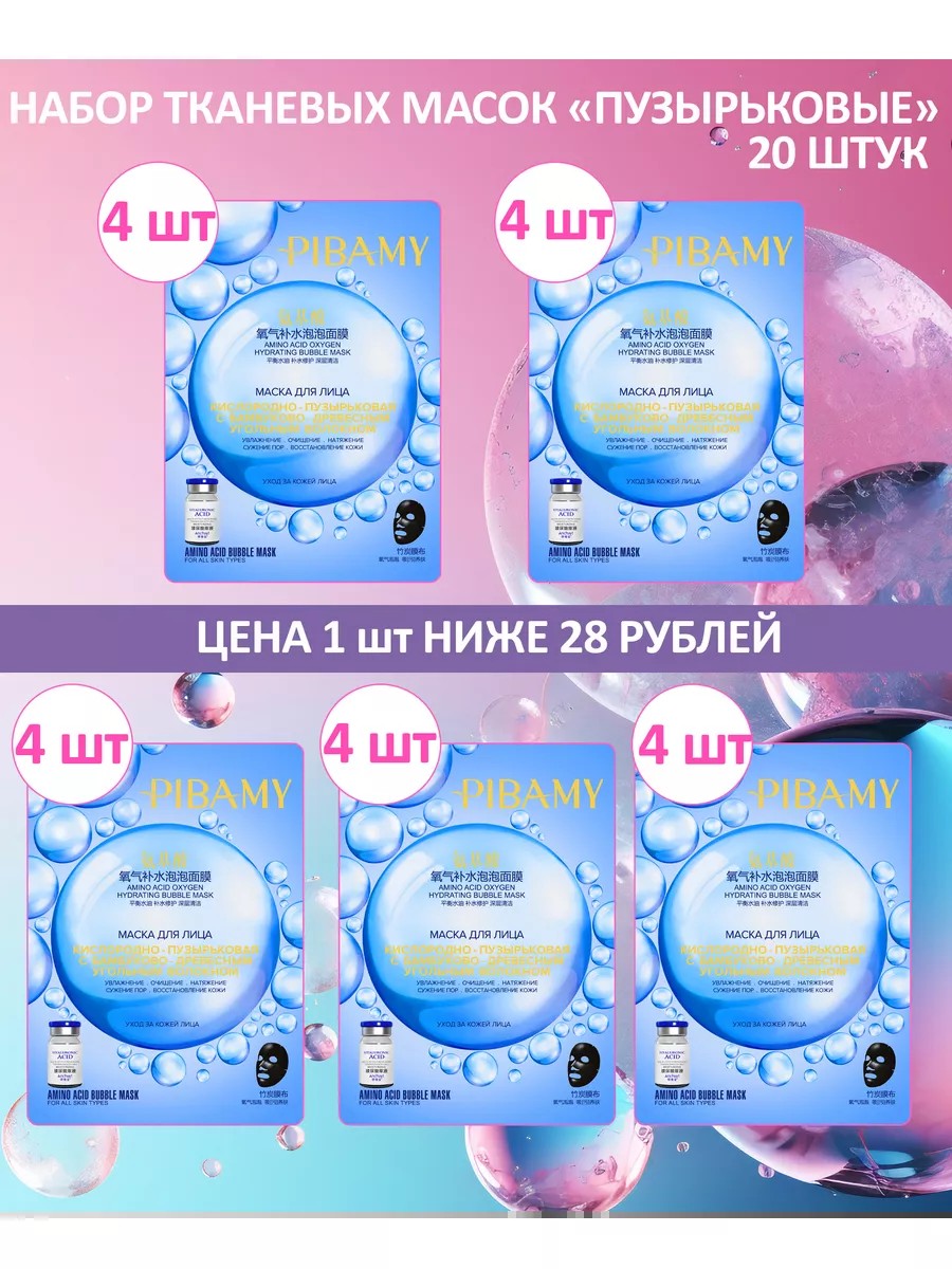 Тканевая маска для лица кислородно-пузырьковая с бамбуково-древесным угольным волокном в наборе 10/20/30 штук обеспечит полноценный курс в домашних условиях. Экономьте на косметологе, преображаясь изо дня в день. Маски для лица упакованы в индивидуальную упаковку и пропитаны увлажняющей, питательной сывороткой.