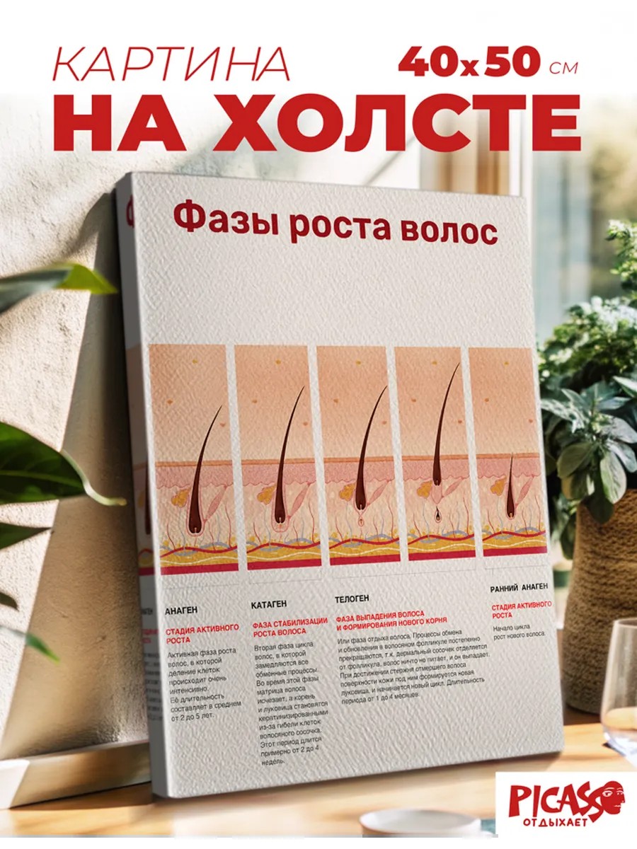 Подарите вашему дому новое настроение с набором картин на стену фазы роста волос размером 40х50 см. Эти элементы создают атмосферу, привнося уют и стиль в любой интерьер. Каждая декоративная картина тщательно выполнена, чтобы стать ярким акцентом в вашей квартире. Представьте, как постер может оживить кухню, добавляя оригинальности и свежести в процесс приготовления пищи. В спальне такое изделие станет источником вдохновения и гармонии. Теперь представьте детскую комнату полную фантазий и сказок, где каждый элемент декора стимулирует воображение вашего ребёнка. Арты на холсте могут рассказать свою уникальную историю. Они легко найдут своё место как среди игрушек, так и книг.