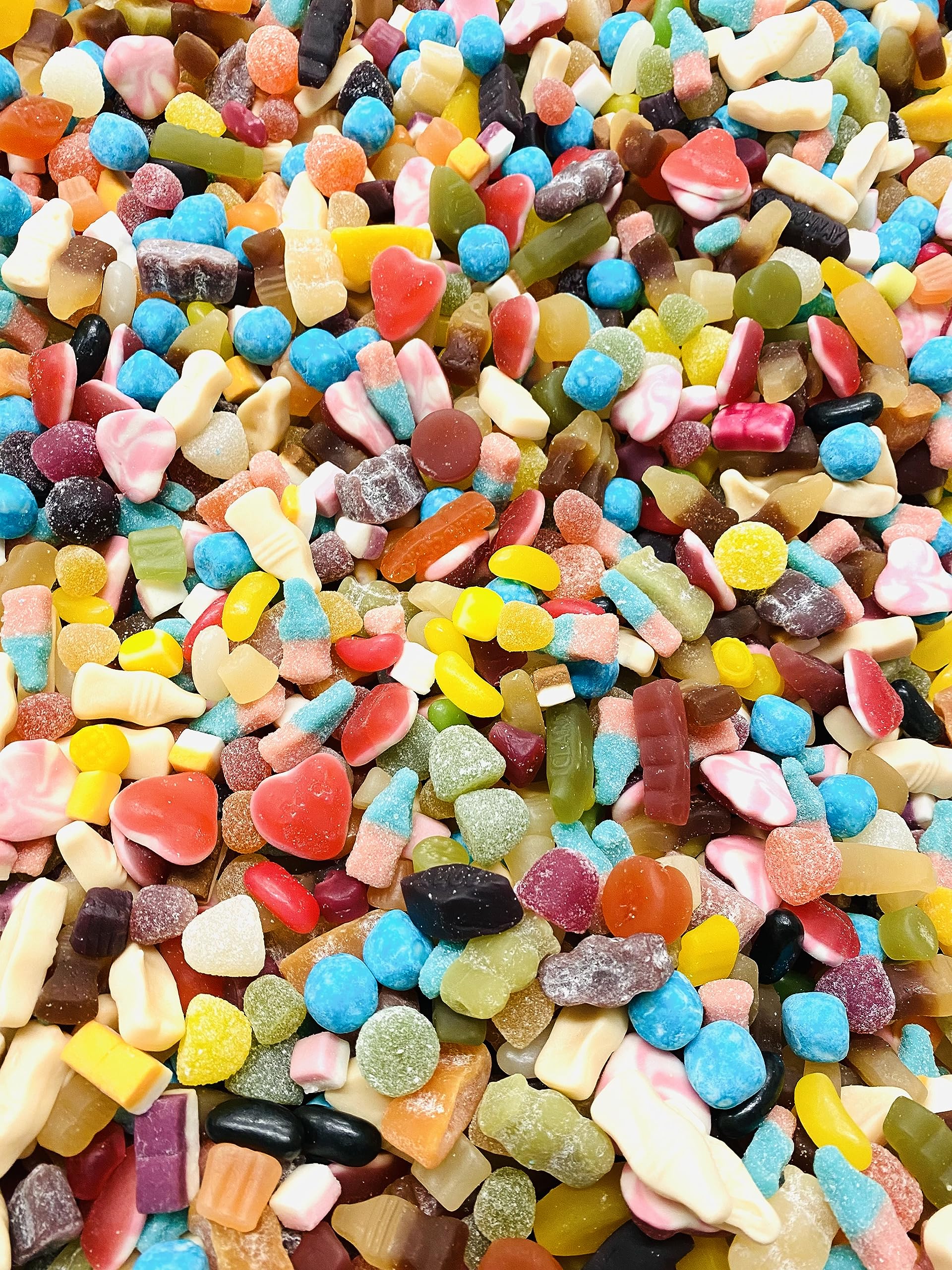Milk Bottles-Sugar, Glucose Syrup, Maize Starch, Beef Gelatine, Flavourings, Vegetable Oils (Palm, Coconut, Sunflower), Glazing Agents (Carnauba Wax, Beeswax).Choking Warning: Not suitable for children under 36 months. Midget Gums-Glucose syrup, sugar, modified maize starch, pork gelatine, acid: citric acid colours: E100, E120, E141, E153 vegetable concentrate: black carrot flavourings, vegetable oil (coconut), glazing agents: carnauba wax. Wine Gums-Glucose syrup, sugar, modified maize starch, pork gelatine, acid: citric acid colours: E100, E120, E141, E153 flavourings, vegetable oil: coconut glazing agent: carnauba wax. Jelly Babies-Sugar, glucose syrup, water, beef gelatine, cornflour,acid (citric acid), flavourings, colours (anthocyanins, curcumin, paprika extract, chlorophylls), plant concentrates: safflower, spirulina. Jelly Beans-Sugar, glucose syrup, cornflour, acid (citric acid), colours (anthocyanins, vegetable carbon,lutein, mixed carotenes), glazing agents (shellac, carnauba wax, beeswax), flavourings, vegetable oils(palm, coconut), stabiliser (gum arabic),plant extracts:safflower, spirulina. Dolly Mixture-Sugar, glucose syrup, beef gelatine, vegetable oil (palm), cornflour,colours (anthocyanins, plain caramel, capsanthin, beetroot red, chlorophylls, lutein), acid (citric acid), flavourings, fat reduced cocoa powder, plant concentrates: safflower, spirulina. Dew Drops-Sugar, Glucose Syrup, Maize Starch, Water, Beef Gelatine,Acid (Citric Acid), Colours (Anthocyanins, Paprika Extract, Curcumin), Flavourings, Plant Concentrates (Safflower, Spirulina). Fizzy Cola Bottles -Sugar, Glucose Syrup, wheat, Starch, Water,Modified Maize Starch, Acids (Lactic Acid, Malic Acid, Citric Acid) Acidity Regulator (Sodium Malates), Modified Potato Starch, Caramel Syrup, Flavouring. Fizzy Bubblegum Bottles-Sugar, Glucose Syrup, Water, Gelatine (Pork), Acids (Lactic Acid, Malic Acid, Citric Acid),Acidity Regulators (Sodium Malates, Sodium Hydrogen Carbonate), Flavouring, Vegetable Concentrate (Black Carrot), Colour (E133). Fried Eggs-Glucose Syrup, Sugar, Dextrose, Gelatine, Acid: Citric Acid,Flavouring, Fruit and Plant Concentrates: Apple, Aronia,Blackcurrant, Carrot, Elderberry, Grape, Hibiscus, Kiwi, Lemon, Mango, Nettle, Orange, Passion Fruit, Spinach, Glazing Agents: Beeswax, Carnauba Wax, Carob Extract. Blue Raspberry Bonbons-Sugar, glucose syrup, vegetable fats (palm, coconut), maltodextrin,acids: citric acid, lactic acid flavouring, acidity regulator: E327 emulsifier: E473, colour: E131. May contain traces of milk, nuts and peanuts. Heart Throbs-Glucose Syrup, Sugar, Dextrose, Gelatine, Acid: Citric Acid,Flavouring,Fruit and PlantConcentrates: Aronia, Blackcurrant, Elderberry, Grape, Glazing Agents: Beeswax, Carnauba Wax, Elderberry Extract.