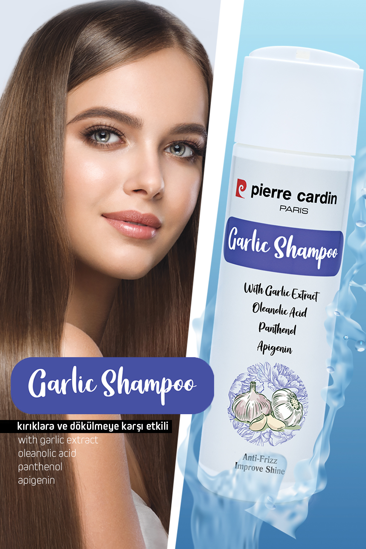 Pierre Cardin Garlic Extract Shampoo Discover the secret of preventing your hair from breaking and falling out! Get shiny and well-groomed hair. With its special formula containing Panthenol, Apigenin and Garlic extract, it strengthens your hair and helps reduce intense hair loss. 200ML