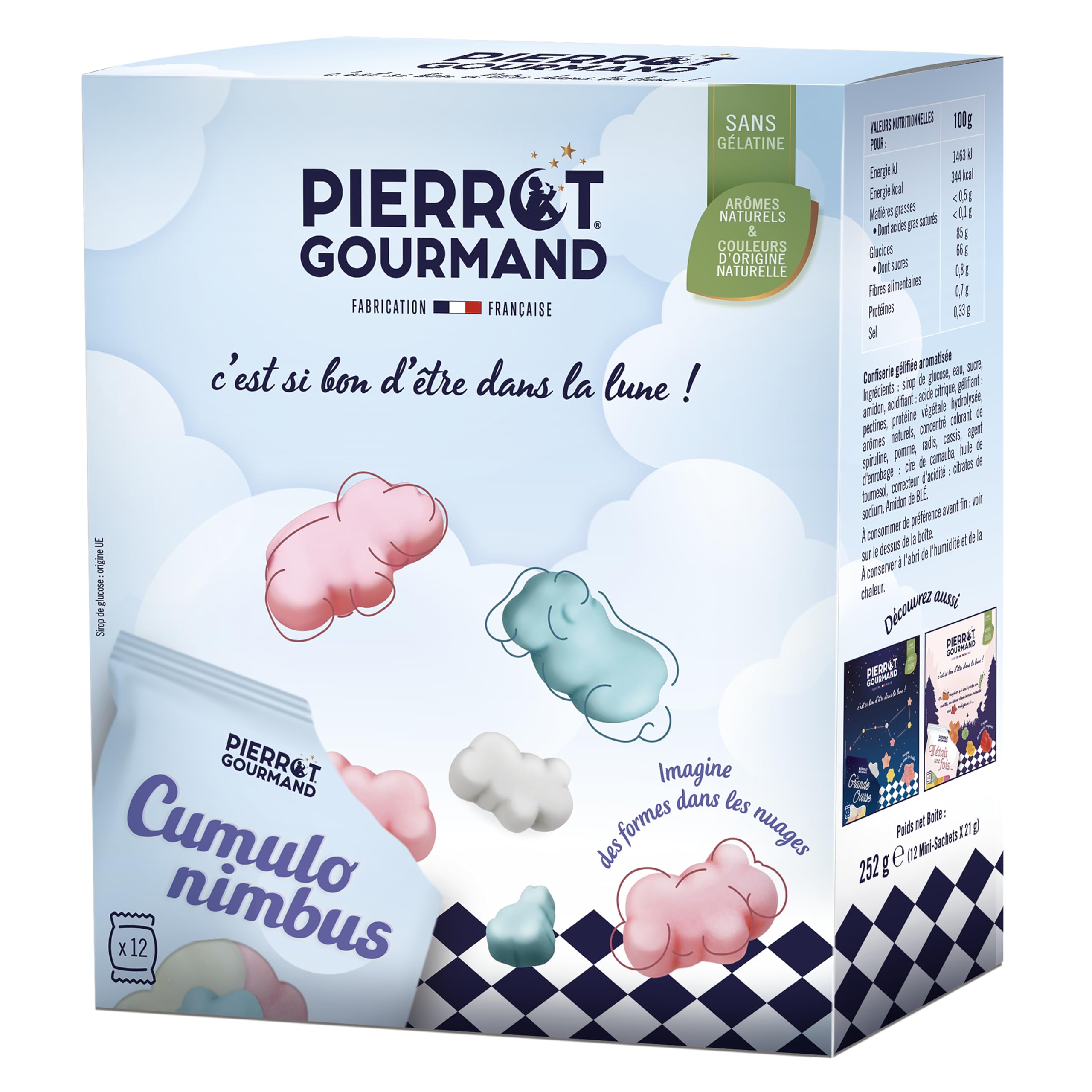 Who hasn't ever played at imagining shapes in the clouds? Imagine cloud-shaped candies in the shape of animals… It's up to you to guess! And enjoy these soft, chewy candies! Ingredients: glucose syrup, water, sugar, starch, acidifier: citric acid, gelling agent: pectins, hydrolyzed vegetable protein, natural flavorings, coloring concentrates of spirulina, apple, radish, blackcurrant, glazing agent: carnauba wax, sunflower oil, acidity regulator: sodium citrates. WHEAT starch. Instructions: Open the box and enjoy the mini bags one by one. Each sachet weighs 21g, which can be considered a single serving. This product is intended for consumption by people of all ages with normal eating habits. See moreNo artificial flavors or colors. Grenadine, yumberry, and dragon fruit flavors. ? Cloud-shaped candies. PIERROT GOURMAND BOX OF 12 MINI CUMULO NIMBUS BAGS.Description du produit Qui n'a jamais joué à imaginer des formes dans les nuages ? Imaginez des bonbons nuages en forme d'animaux… A vous de deviner ! Et de savourer des bonbons moelleux tous doux ! Ingrédients sirop de glucose, eau, sucre, amidon, acidifiant : acide citrique, gélifiant : pectines, protéine végétale hydrolysée, arômes naturels, concentrés colorants de spiruline, pomme, radis, cassis, agent d'enrobage : cire de carnauba, huile de tournesol, correcteur d'acidité : citrates de sodium. Amidon de BLE. P.when('A').execute(function(A) { A.on('a:expander:toggle_description:toggle:collapse', function(data) { window.scroll(0, data.expander. expander[0].offsetTop-100) }) }) Mode d'emploi Ouvrir la boîte et savourer les mini sachets un par un. Chaque sachet pèse 21g, ce qui peut être considéré comme une portion individuelle. Ce produit est destiné à être consommé par des personnes de tout âge avec des habitudes de consommation normales. Voir plusSans arômes et colorants artificiels. Saveurs grenadine, yumberry et fruit du dragon. ? Bonbons en forme de nuages. PIERROT GOURMAND BOITE 12 MINI SACHETS CUMULO NIMBUS.Pierrot Gourmand - Boîte 12 Mini Sachets CUMULO NIMBUS - 252g multicolore Moyen