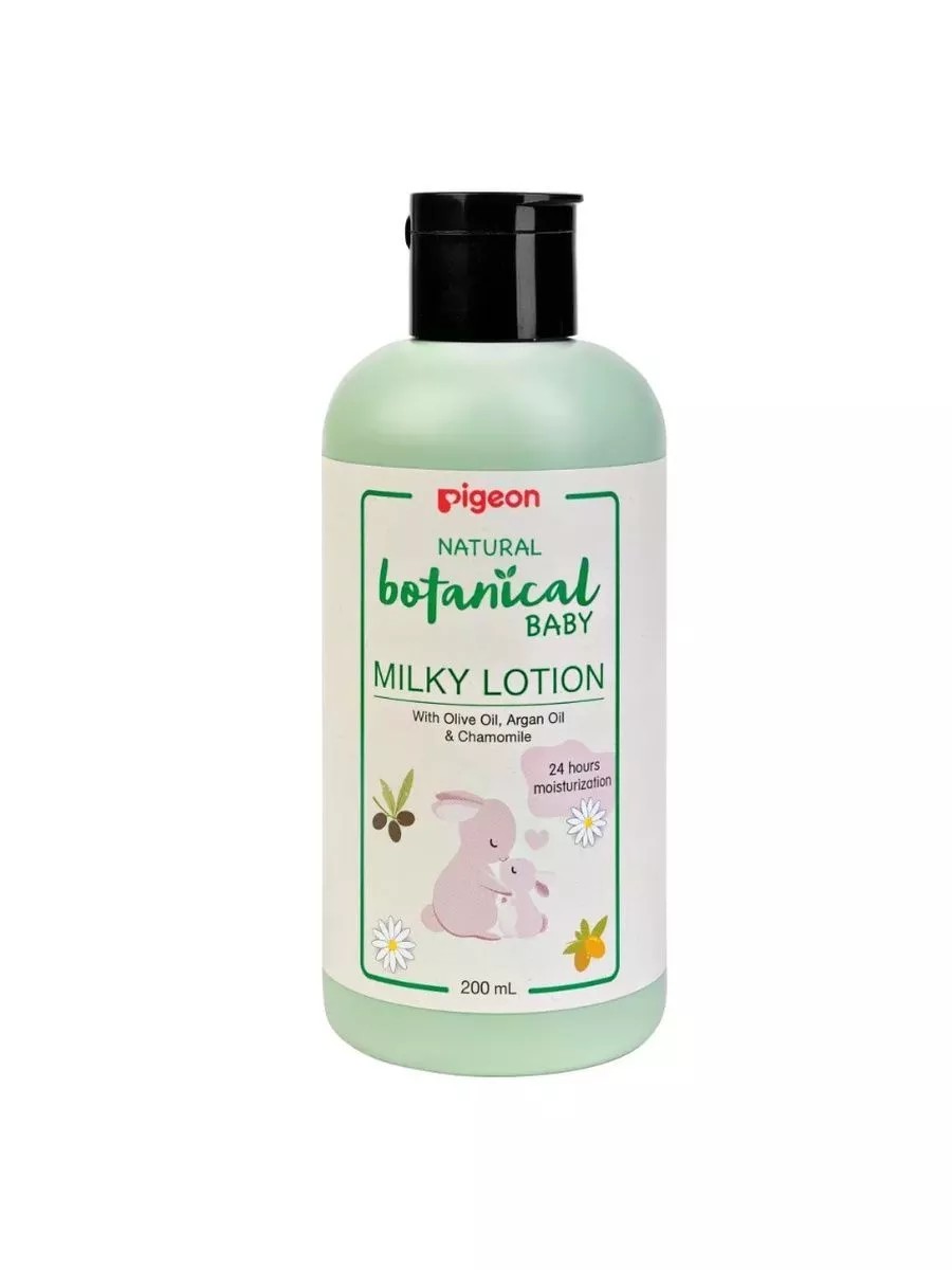 PIGEON Natural Botanical Baby Milky Lotion, 200 ml (1 pc.) This milk contains moisture-retaining ingredients such as olive and argan oils, which help protect and retain baby's skin's natural moisture, leaving it smooth and extra soft. It has a gentle, non-sticky texture. Suitable for babies from birth. Suitable for all skin types. pH-balanced. Dermatologically tested for skin irritation, allergic reaction, eye irritation, and toxicology. Free of parabens, formaldehyde, and alcohol.