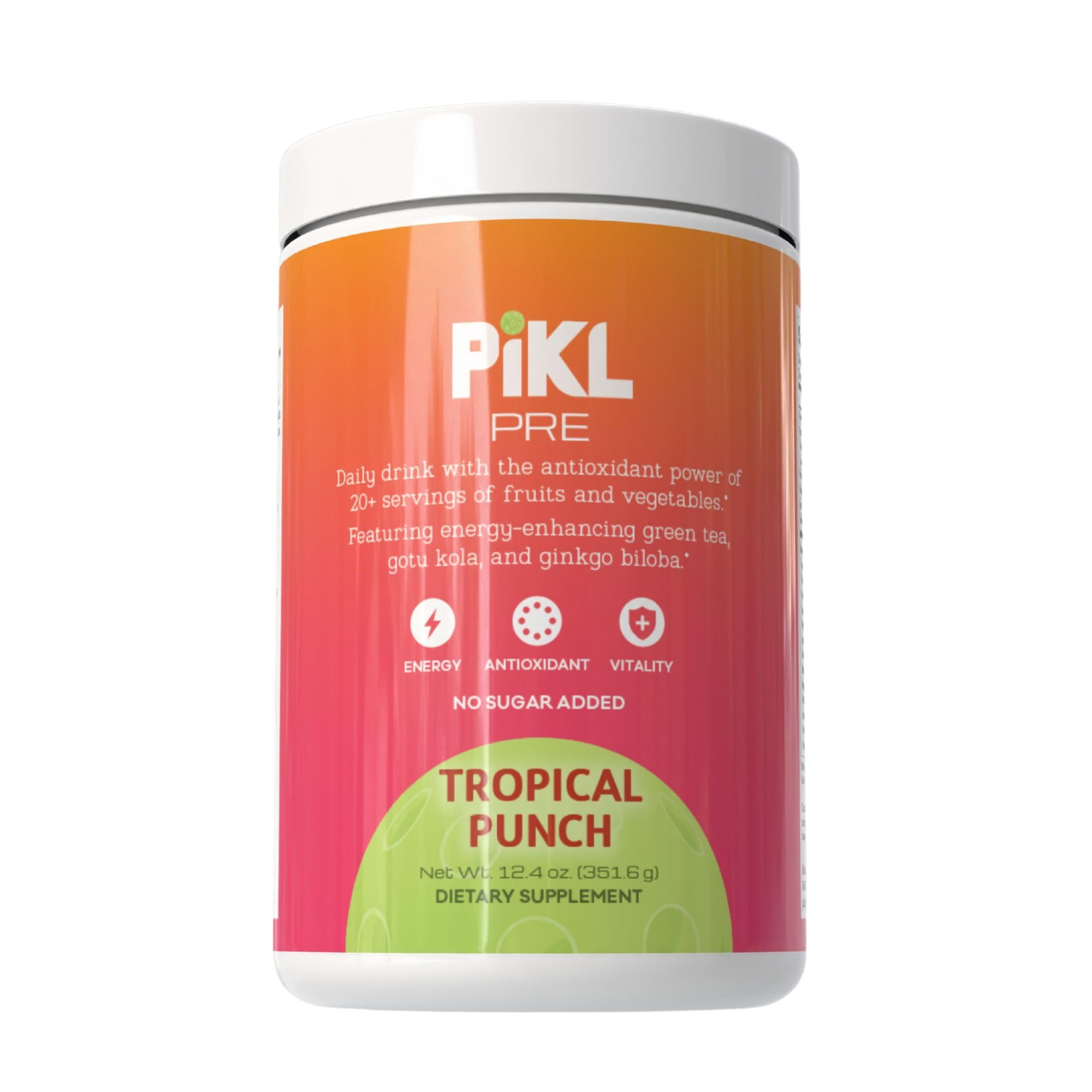 Start your game with focus, energy, and clarity. PiKL Nutrition Pre is a clean energy powder designed specifically for pickleball players who want sharp mental focus, smooth endurance, and natural fuel that lasts from first serve to final rally, without the crash. Each serving blends 80 mg Gotu Kola and 60 mg Ginkgo Biloba, two clinically studied botanicals that support circulation, brain function, and calm concentration. This natural energy powder drink mix sharpens reaction time and keeps your mind clear and composed during high-pressure points. For recovery and longevity, PiKL Pre includes a 2.86 g SuperFruit Antioxidant Blend delivering the power of 20 fruits and vegetables to combat oxidative stress and aid muscle repair. Combined with a 2.4 g Digestive Enzyme Probiotic Blend, it promotes gut balance, nutrient absorption, and immune support—because sustained energy starts from within. Unlike typical workout mixes or caffeinated pre-workouts, PiKL Nutrition Pre is your daily healthy energy drink powder for steady focus and stamina. No spikes. No crashes. Just clean, consistent energy that fuels your movement and your mind. Perfect for early morning matches, long tournaments, or afternoon energy slumps, PiKL Nutrition Pre is Non-GMO, Gluten-Free, Dairy-Free, and Vegan, crafted for those who value clean performance and mental clarity. Power your play naturally with PiKL Nutrition Pre, the best energy drink powder made for pickleball players and anyone who wants energy that keeps up with their game.CLEAN, HEALTHY FORMULA: Non-GMO, Gluten-Free, Dairy-Free, and Vegan energy powder mix with no artificial colors or sweeteners. The ultimate powder energy drink for players who demand performance with purpose. GUT IMMUNE SUPPORT: 2.4 g Digestive Enzyme Probiotic Blend promotes nutrient absorption, digestive health, and immune balance for sustained all-day stamina, perfect for athletes needing consistent clean energy. SUPERFRUIT ANTIOXIDANT POWER: 2.86 g SuperFruit Antioxidant Blend provides the strength of 20 fruits and veggies. This healthy energy drink powder fights oxidative stress and supports faster post-game recovery. BOTANICAL BRAIN BOOST: 80 mg Gotu Kola 60 mg Ginkgo Biloba deliver lasting focus, improved circulation, and mental sharpness. A smarter energy powder drink mix that keeps your head in the game from serve to match point. ENERGY FOCUS FOR PICKLEBALL: Designed for clarity, endurance, and calm energy. This clean energy drink powder helps you stay sharp and steady through every rally, without the jitters or crash of traditional energy drink powders.