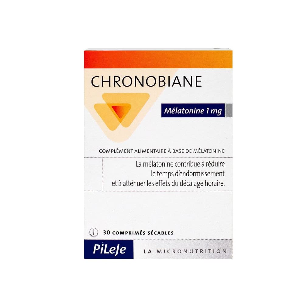 PILEJE CHRONOBIANE 30 tablets PROPERTIES: CHRONOBIANE from PILEJE is a food supplement formulated with melatonin. It helps reduce the time it takes to fall asleep in people who have difficulty falling asleep. CHRONOBIANE also helps mitigate the effects of jet lag. ADVICE FOR USE: - For difficulty falling asleep: Take 1 CHRONOBIANE tablet per day to swallow before bedtime. Above all, do not exceed 3 consecutive weeks of supplementation without the advice of a health professional. - For jet lag: Take ½ CHRONOBIANE tablet to swallow at bedtime, on the first day of travel, then for 4 to 8 days after arrival at your destination. COMPOSITION: 1st box of 30 scored tablets Melatonin (1mg per tablet) - Bulking agent: microcrystalline cellulose - Corn starch - Tricalcium phosphate - Anti-caking agents: magnesium stearate - Colloidal silica. INGREDIENTS melatonin, bulking agent: microcrystalline cellulose, corn starch, tricalcium phosphate, anti-caking agents: magnesium stearate, colloidal silica.Adult. Reduce the time it takes to fall asleep. PILEJE CHRONOBIANE 30 comprimés PROPRIÉTÉS : CHRONOBIANE de PILEJE est un complément alimentaire formulé à base de mélatonine. Il contribue à réduire le temps d endormissement chez les personnes qui ont des difficultés à trouver le sommeil. CHRONOBIANE permet également d atténuer les effets du décalage horaire. CONSEILS D UTILISATION : - Pour les difficultés d endormissement : Prenez 1 comprimé CHRONOBIANE par jour à avaler avant le coucher. Surtout, ne dépassez pas 3 semaines consécutives de complémentation sans l avis d un professionnel de santé. - Pour les décalages horaires : Prenez ½ comprimé CHRONOBIANE à avaler au coucher, le premier jour du voyage, puis pendant 4 à 8 jours après l arrivée à destination. COMPOSITION : 1e boite de 30 comprimés sécables Mélatonine (1mg par comprimé) - Agent de charge : cellulose microcristalline - Amidon de maïs - Phosphate tricalcique - Anti-agglomérants : stéarate de magnésium - Sillice colloïdale. INGRÉDIENTS mélatonine, agent de charge : cellulose microcrystalline, amidon de maîs, phosphate tricalcique, anti-agglomérants :stéarate de magnésium, silice colloîdale.adult. Réduire le temps d'endormissement.