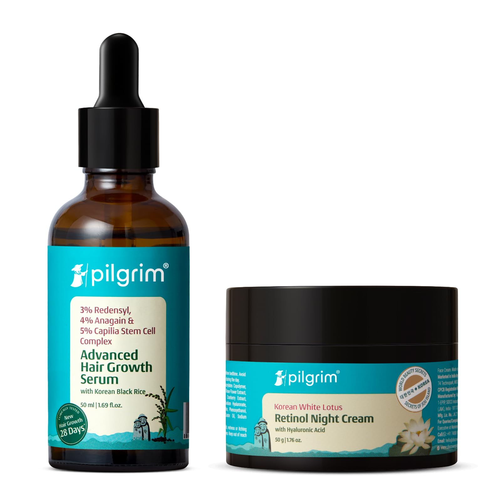 upport healthier hair growth and overnight skin renewal with the Pilgrim Advanced Hair Growth Serum with 3 Redensyl, 4 Anagain 5 Capilia Stem Cell Complex and Korean White Lotus Retinol Night Cream with Hyaluronic Acid. This targeted combo brings together a high-performance scalp treatment and a night repair cream designed to work as part of your daily haircare and nighttime skincare routine. The Advanced Hair Growth Serum helps support the hair growth cycle, reduce hair fall, and improve hair density with regular use. The Korean White Lotus Retinol Night Cream is crafted to enhance the skin's natural repair process overnight, helping address signs of ageing while improving skin texture, firmness, and hydration. Together, this duo delivers focused care for stronger hair and youthful-looking skin.