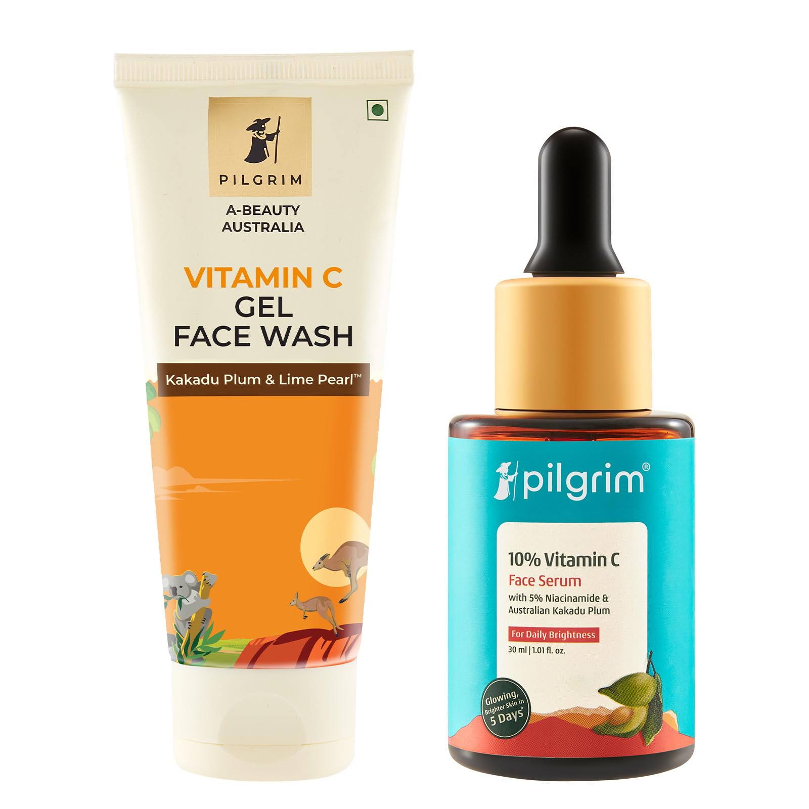 Pilgrim Vitamin C combo: 10% Vitamin C Serum (30ml) & Australian Kakadu Plum Gel Face Wash (100ml) | Glowing skin | Reduces Dark Spots | Evens Skin Tone & Enhances Glow