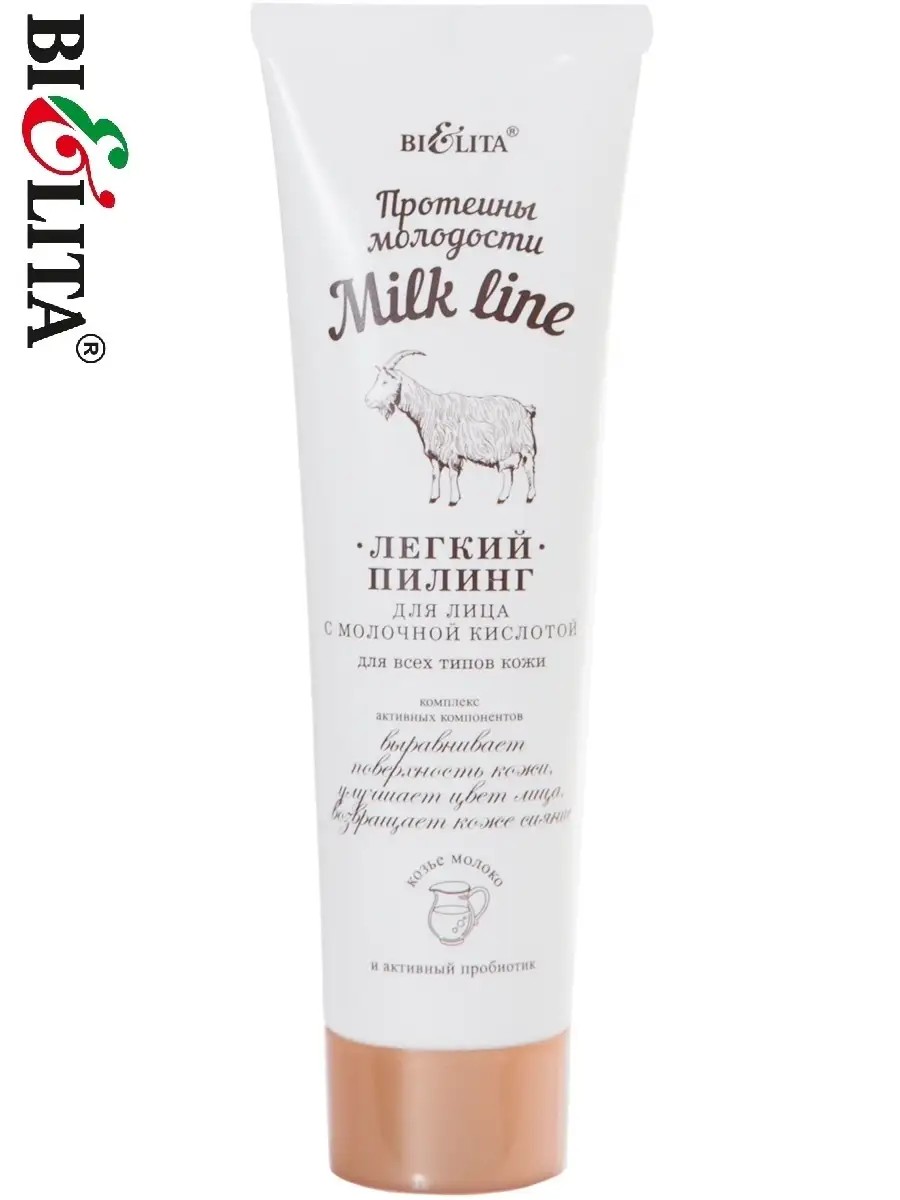 Пилинг легкий для лица с молочной кислотой Milk line Протеины молодости Belita .Легкий пилинг благодаря активной формуле, содержащей молочную кислоту, мягко очищает кожу, отшелушивает омертвевшие клетки эпидермиса и сужает поры. При регулярном использовании дарит коже невероятную свежесть, безупречную чистоту и сияние. Протеины козьего молока в комплексе с активным пробиотиком омолаживают, питают и смягчают кожу, делая ее нежной и шелковистой. TONISKIN стимулирует синтез коллагена, разглаживает морщины и выравнивает цвет лица. Комплекс витаминов A,C,E,F обладает высокой антиоксидантной активностью, улучшает клеточную регенерацию кожи, благодаря чему кожа быстрее обновляется и выглядит моложе. Масло кокоса мгновенно восстанавливает и питает кожу.